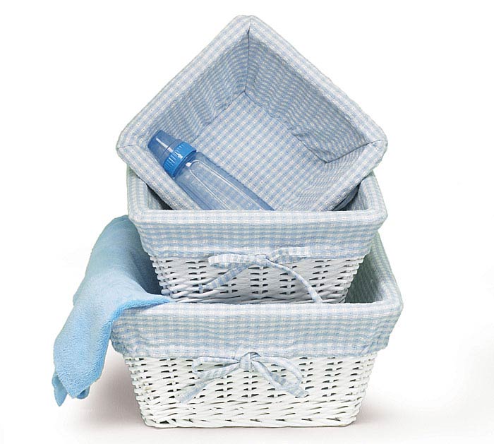 Set of 3 white willow baskets with blue cotton gingham lining in each basket.