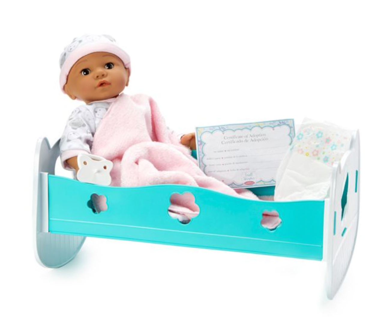 This adorable 14" baby doll is just waiting to be adopted and loved. Includes a cradle/changing table, blanket, pacifier, diaper and birth certificate to make it official. This little one has almost everything you need! For ages 3+