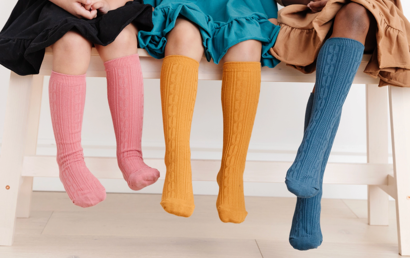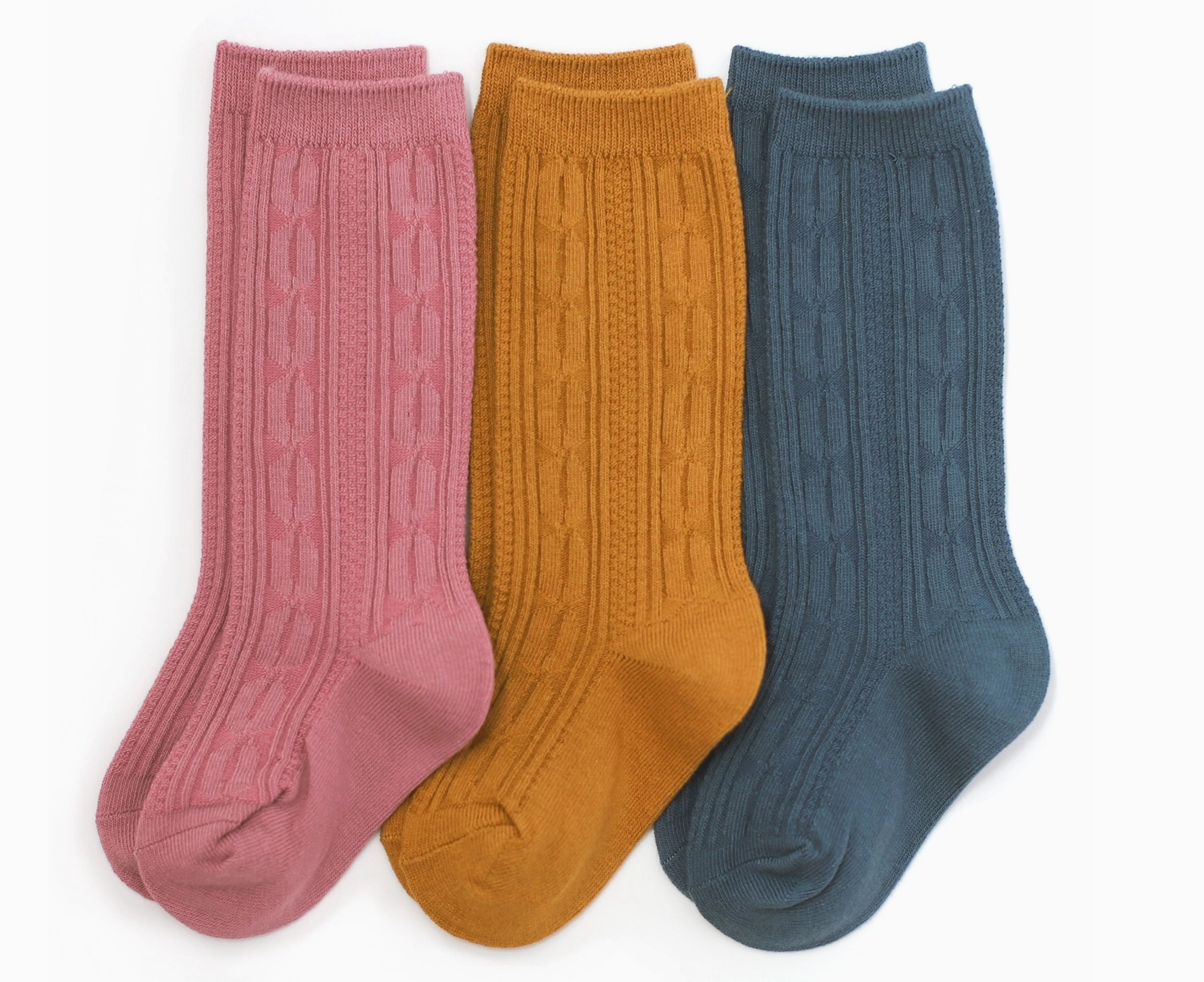 Art Class Knee High Sock 3-Pack Grab your canvas, easel and paints. It's time for Art Class! Each 3-Pack includes one of each of the following cable knit knee highs: * French Blue * Old Rose * Mustard 3-Packs are prepackaged together as a set and cannot be separated for individual resell. Knee Highs are meant to hit just below the knee. Slight variations in sock length are normal. Machine wash cold with like colors. Tumble dry low or lay flat to dry. 79% cotton / 19% polyester / 2% spandex Imported.