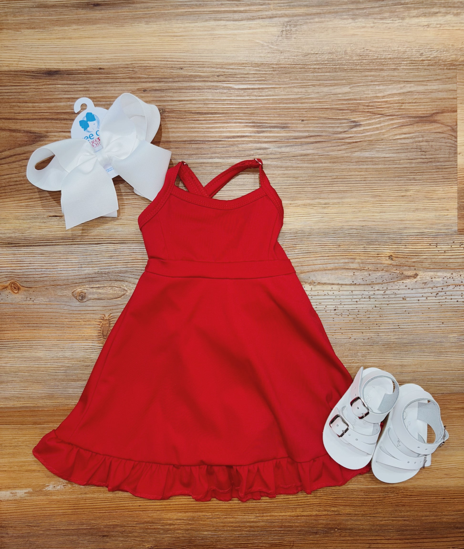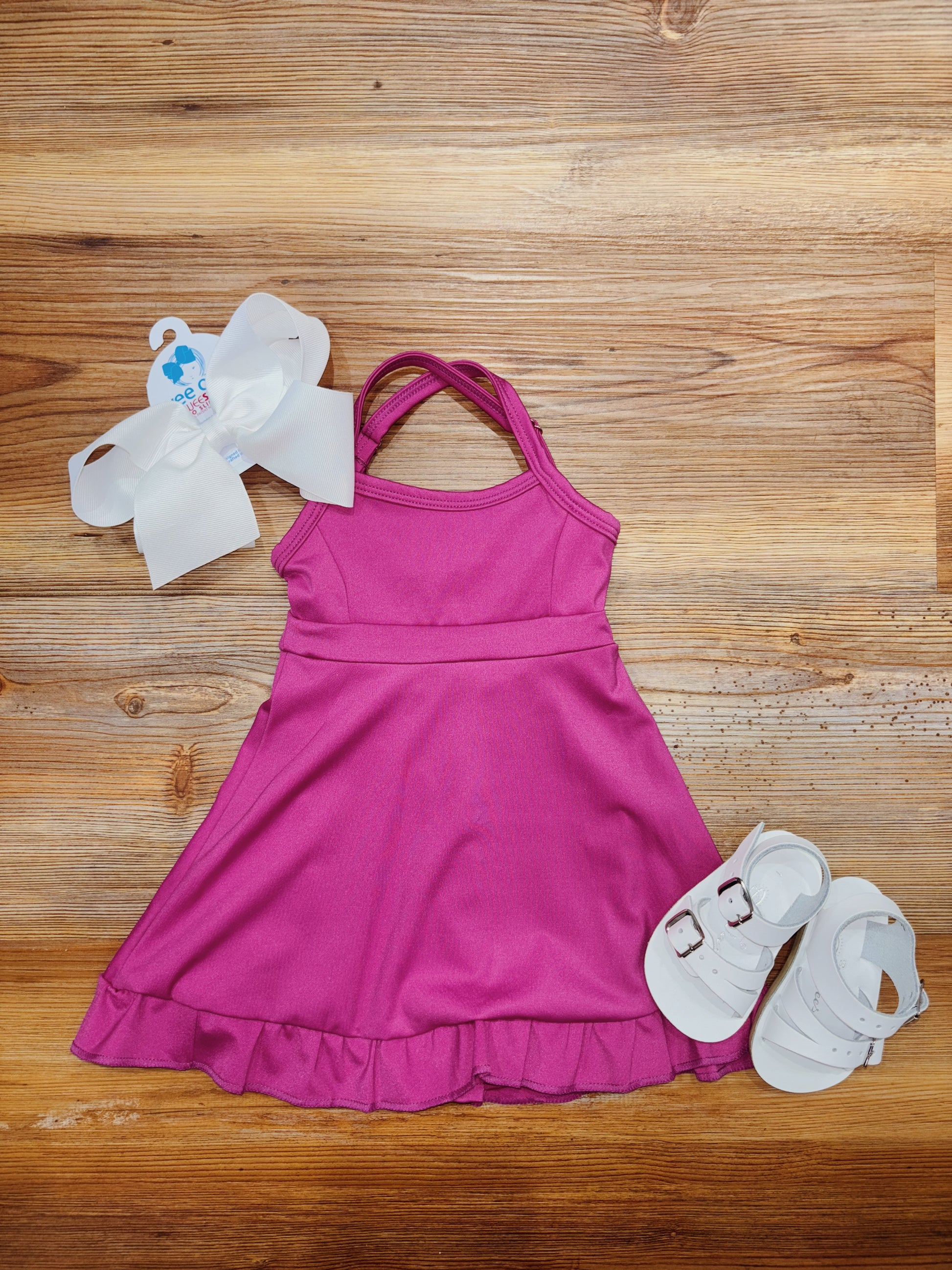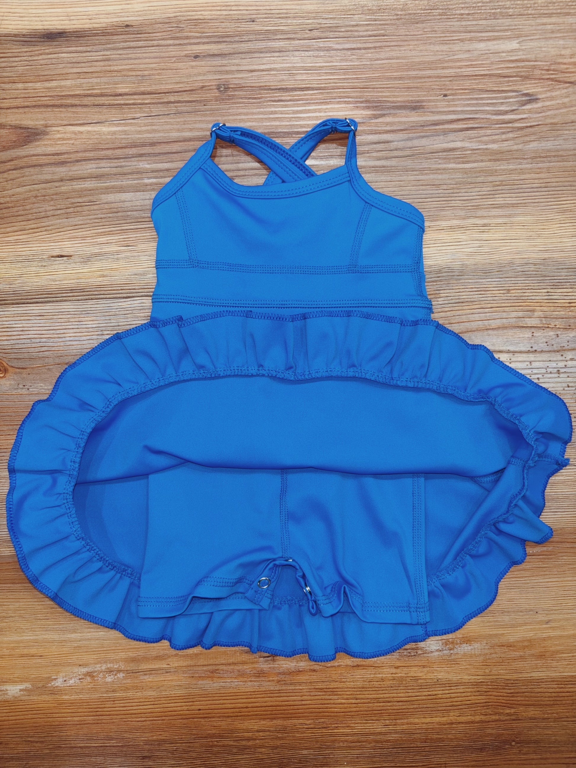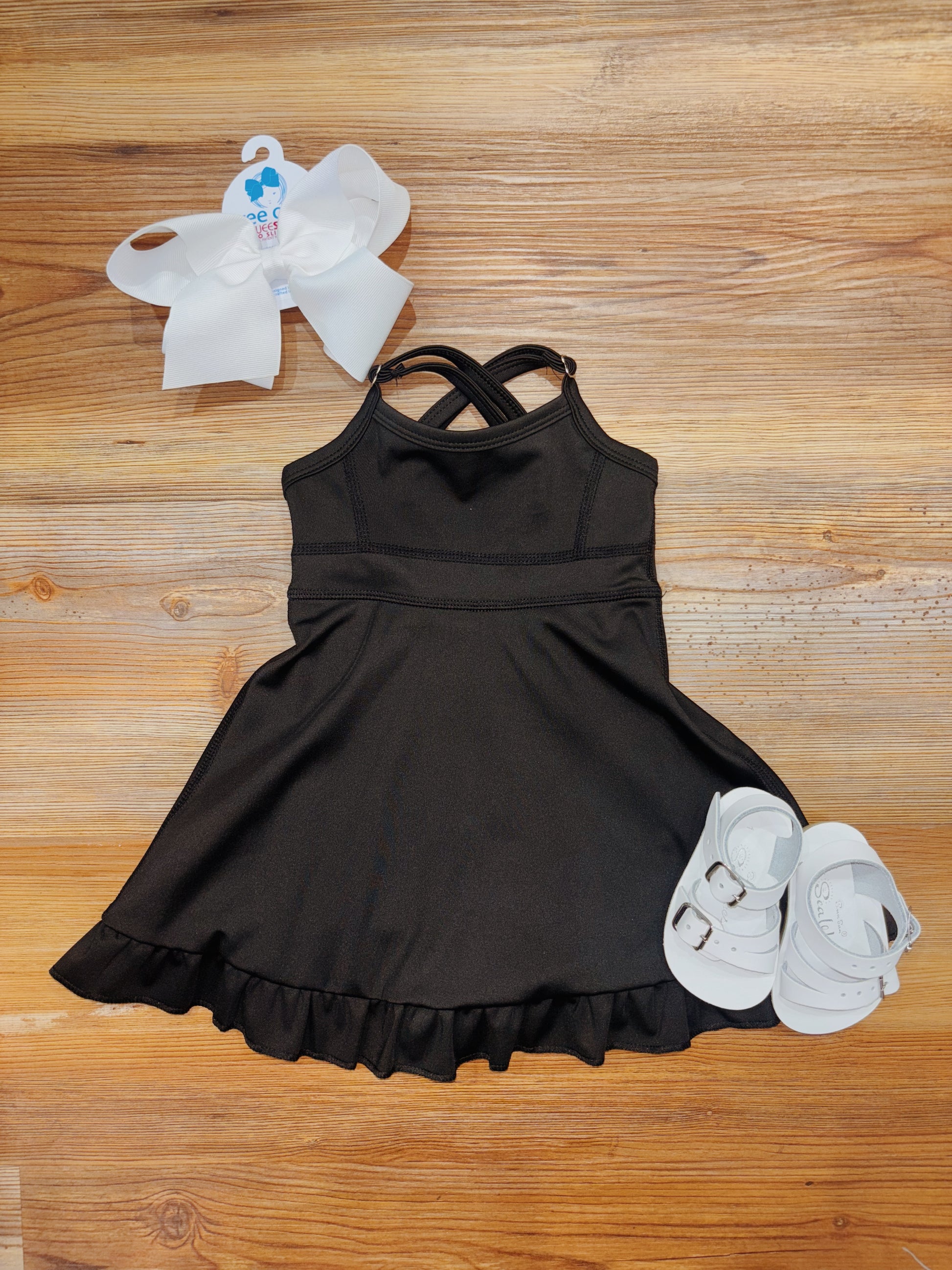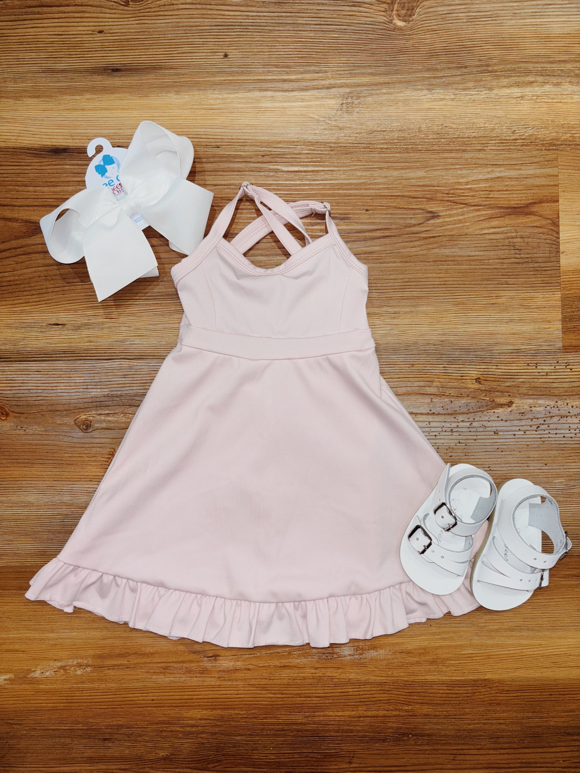This playful yoga dress features a criss-cross back design and a flirty ruffle hem that moves with you. Built-in shorts provide comfort and coverage, making it perfect for any active day. Crafted from soft, stretchy yoga material, it keeps you feeling free and fabulous from studio to street.