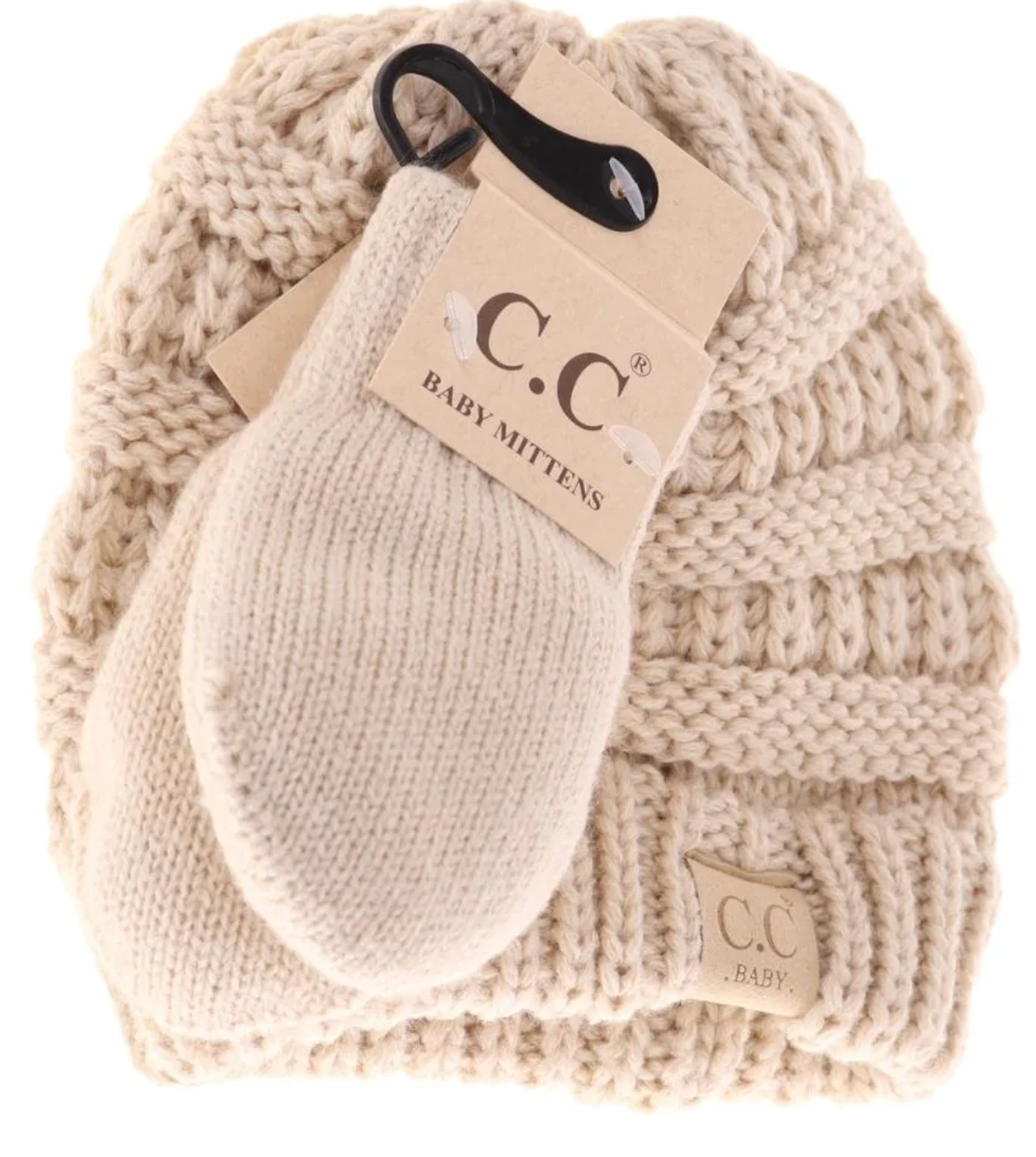 These baby sets are perfect for your newest member of the family! They feature a classic knit C.C baby beanie with matching mittens that are fuzzy lined!