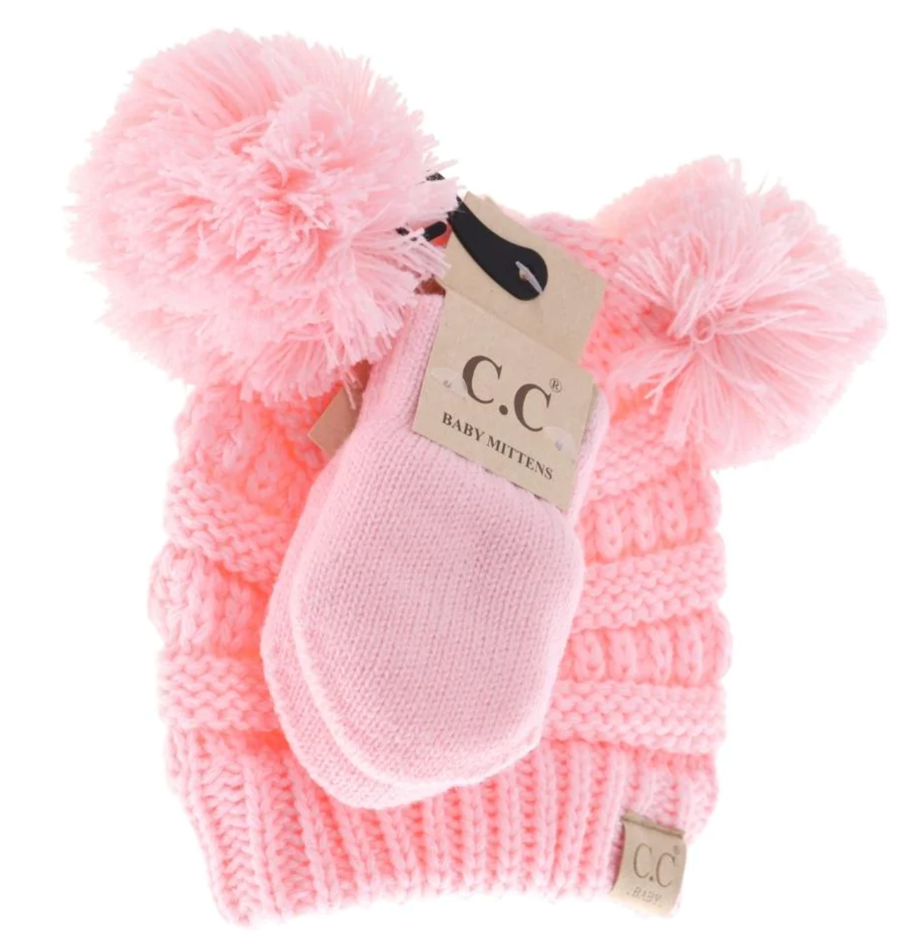 These baby sets are perfect for your newest member of the family! They feature a classic knit C.C baby beanie and knit double poms with matching mittens that are fuzzy lined!