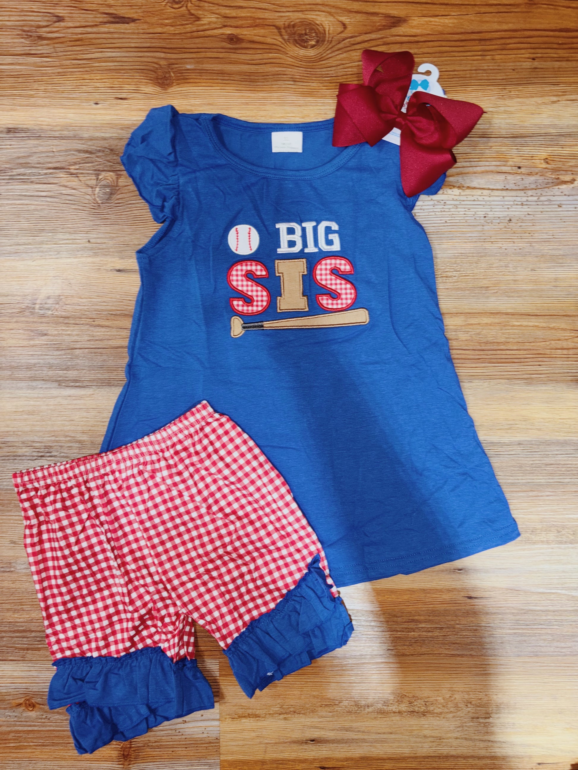 Get your little fashionista ready for a game day with our embroidered Big Sister Baseball outfit. The blue ruffle sleeves shirt pairs perfectly with the red gingham shorts featuring blue ruffles, creating a stylish and comfy look. Cheer on the team in style!