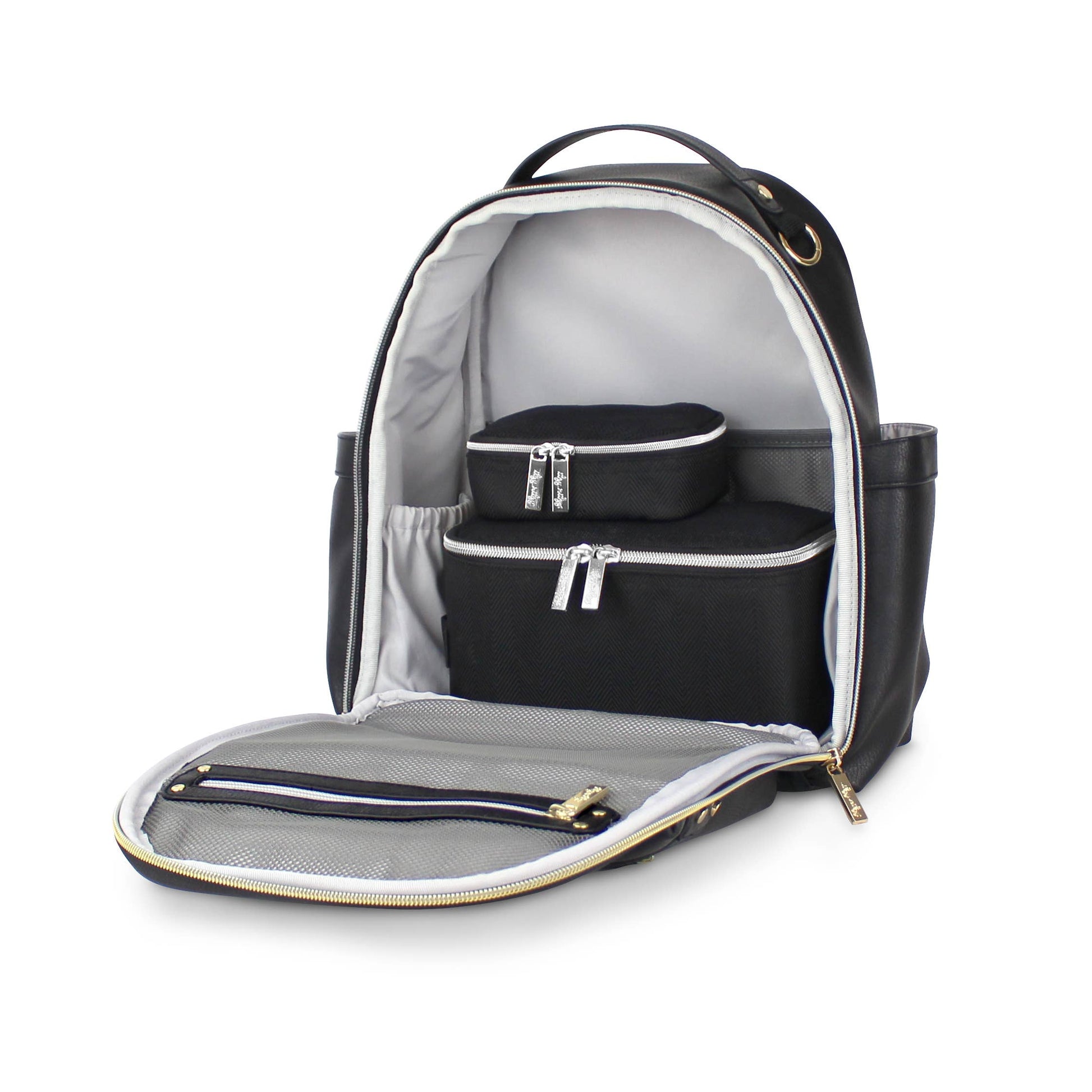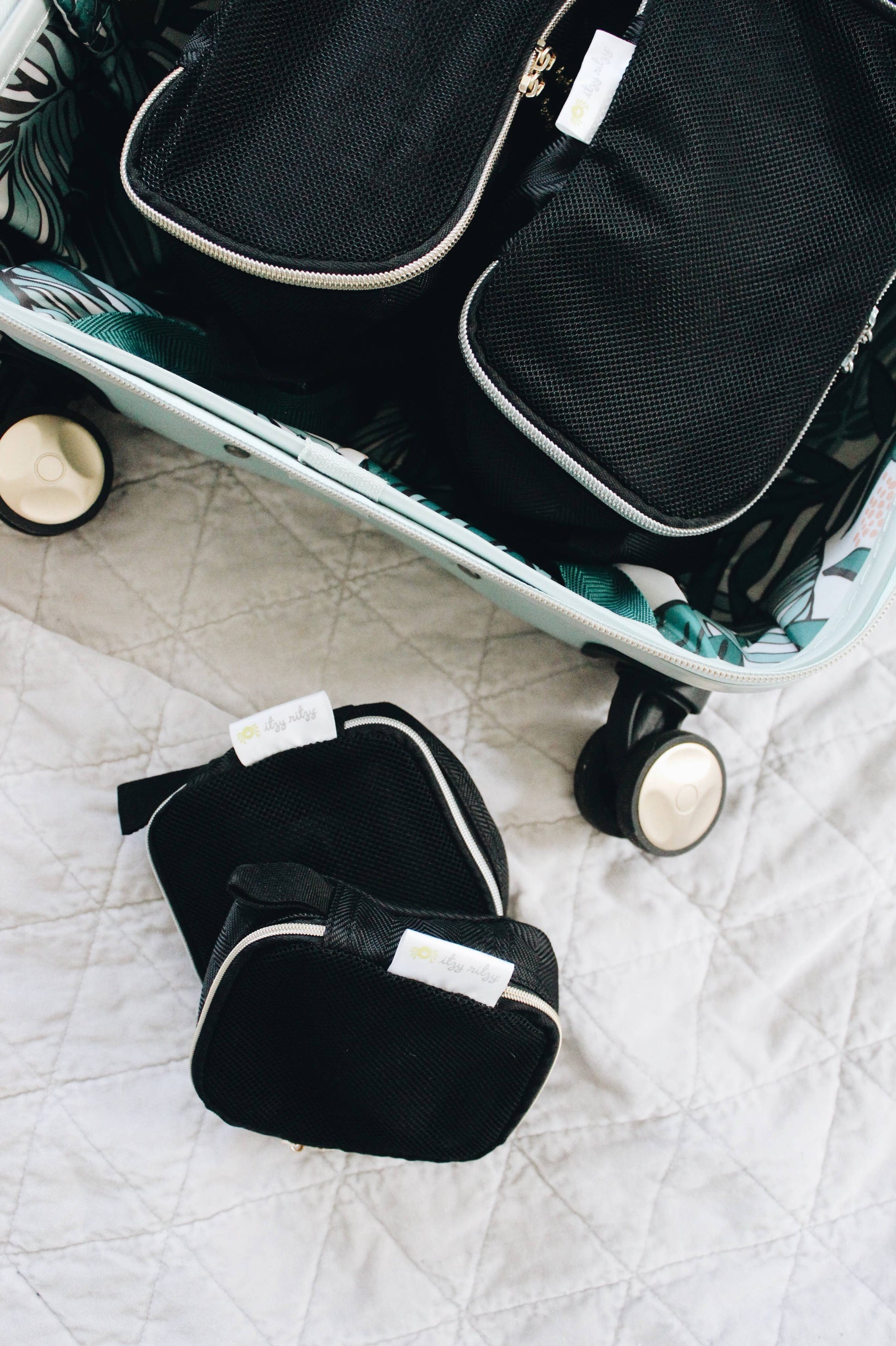 Staying organized has never been easier or more stylish! Our set of three packing cubes can be used together or individually, making them the ultimate diaper bag storage organizers for traveling and life on the go! Has a mesh panel for viewing contents, easy carry handle, and coordinates with favorite Itzy Ritzy Diaper Bags - like the Black Herringbone Boss Backpack™!