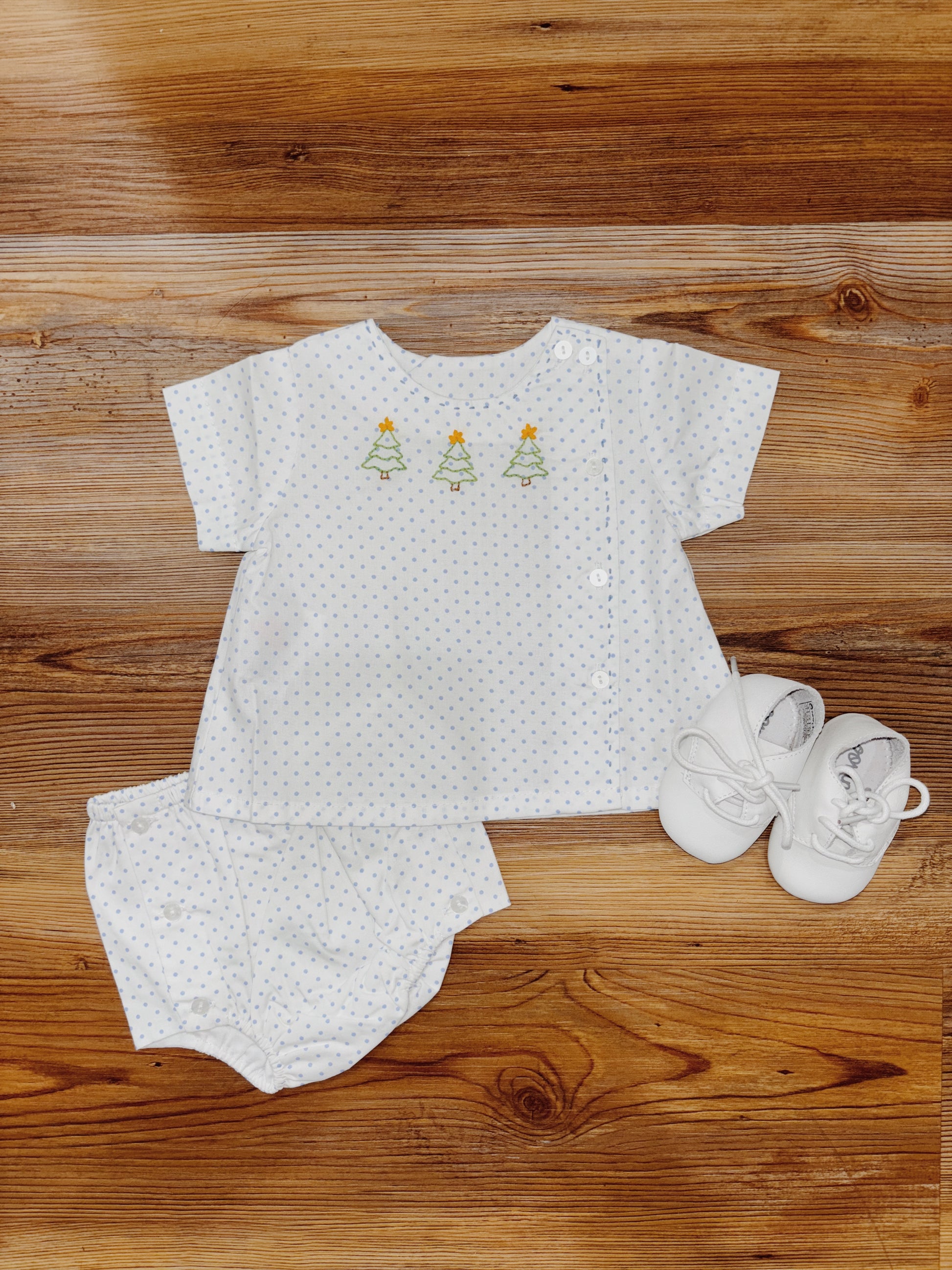 Get in the holiday spirit with this festive blue polka dot outfit set for your little boy! Perfect for Christmas photos under the tree.