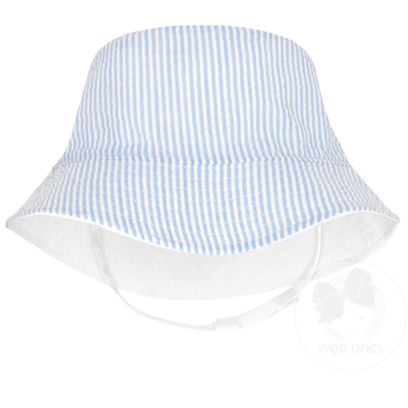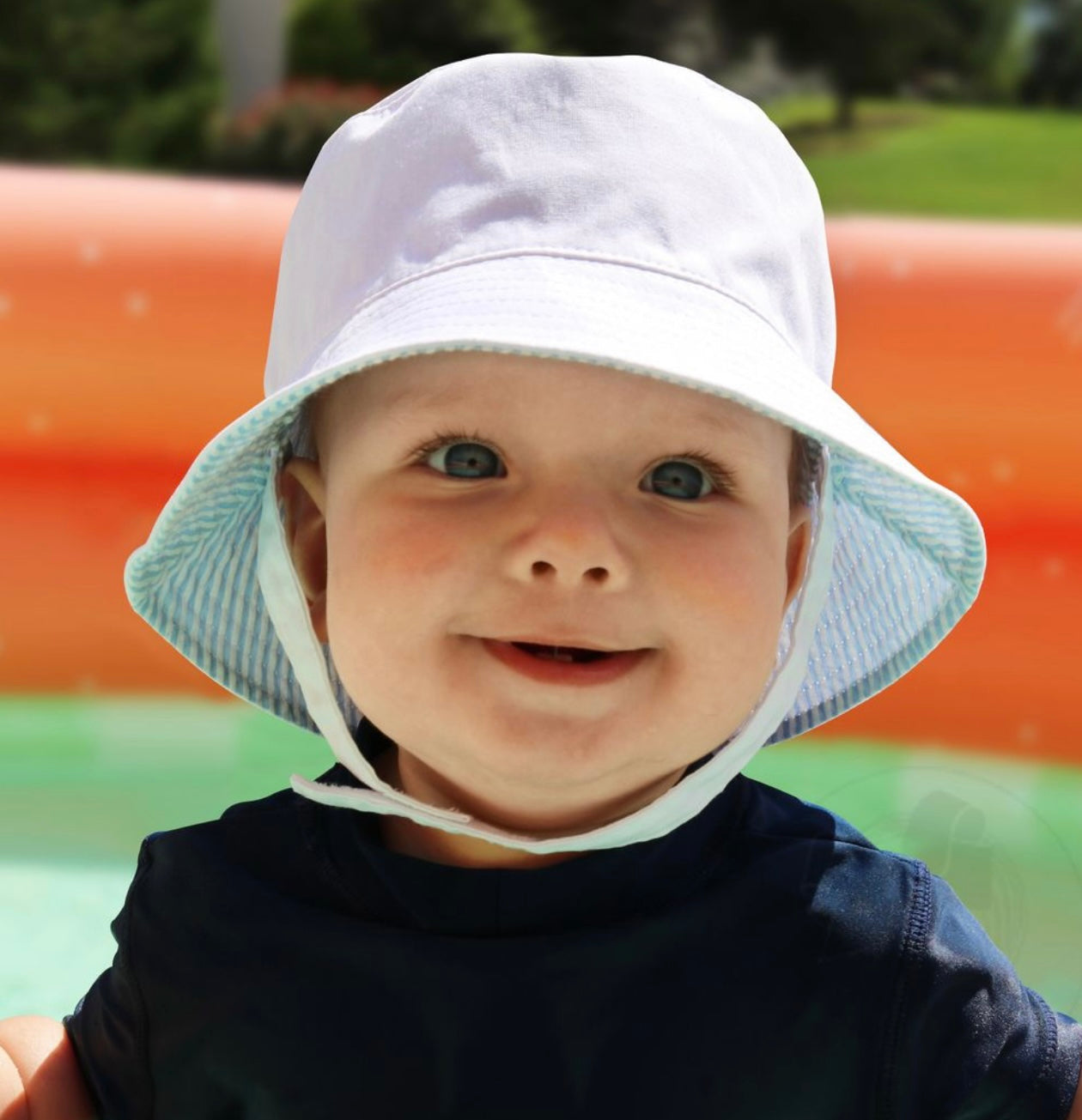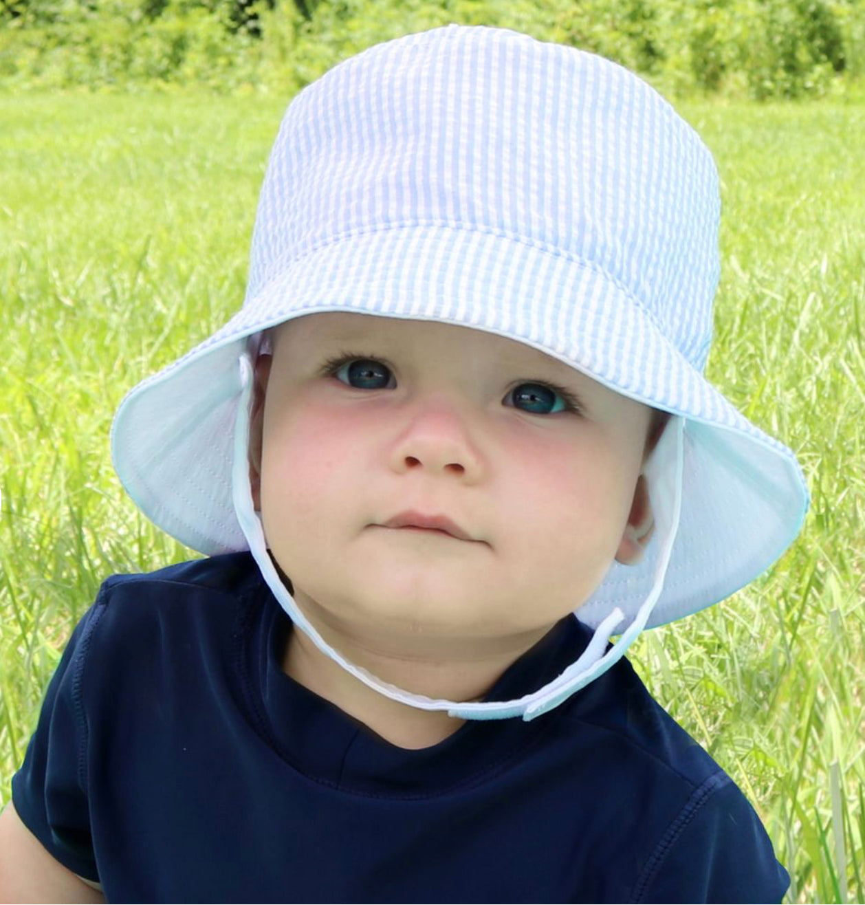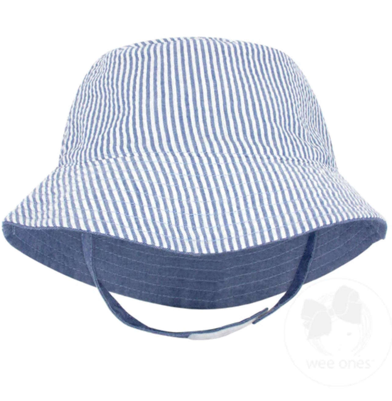 This reversible boy’s bucket hat is available in both a fun light blue & denim Seersucker fabric that reverses to solid white or solid navy for maximum versatility. Our hat also features an adjustable chin strap with an ultra-soft fastener and a UPF rating of 50+, making it both a functional and fashionable accessory. Cotton/polyester blend.