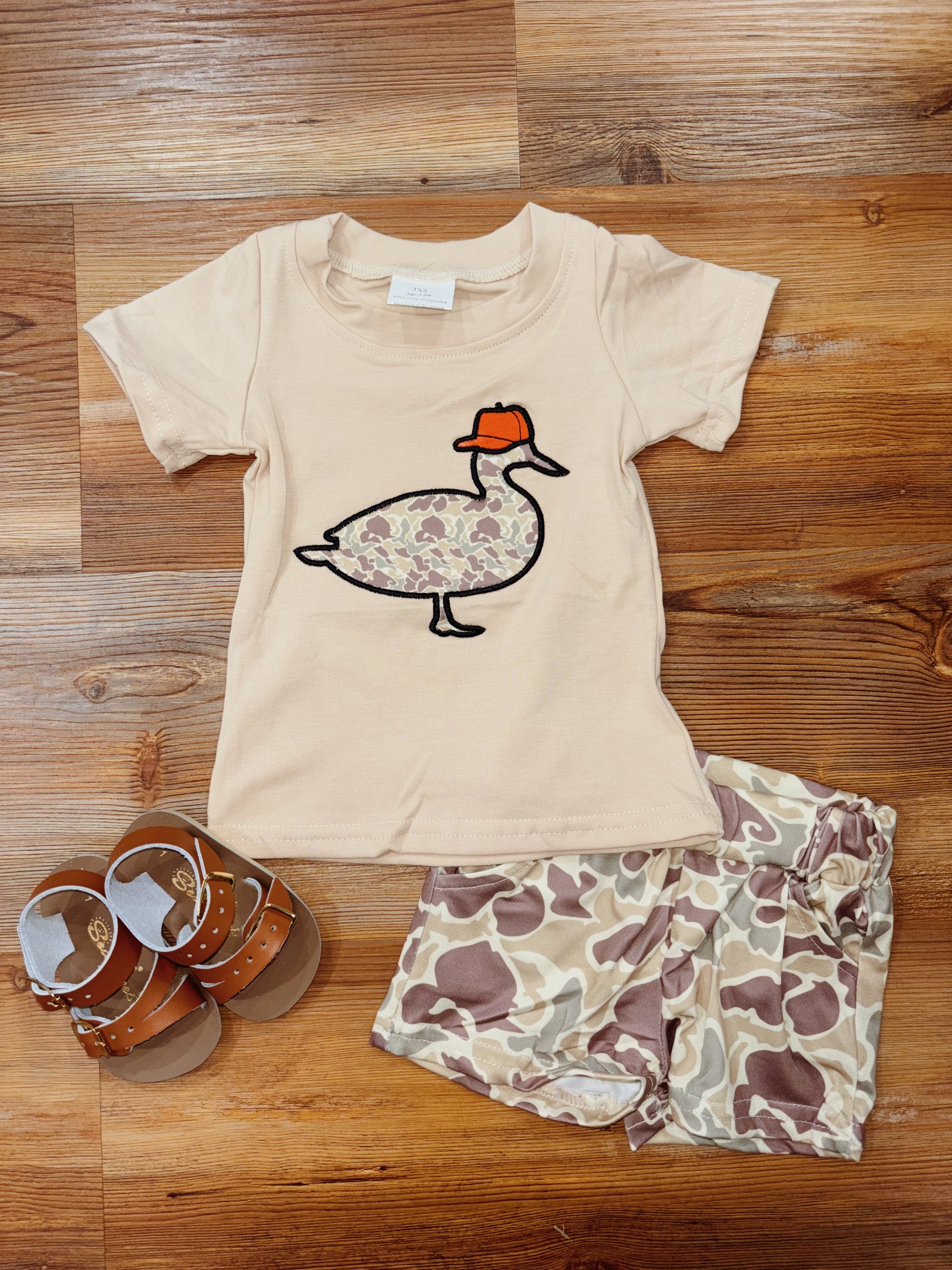 This boys' set includes a tan shirt with short sleeves and camo duck embroidery on the hat. The camo shorts complete the look for a fun yet stylish outfit. Made for the adventurous little ones, this set is perfect for any outdoor activity.