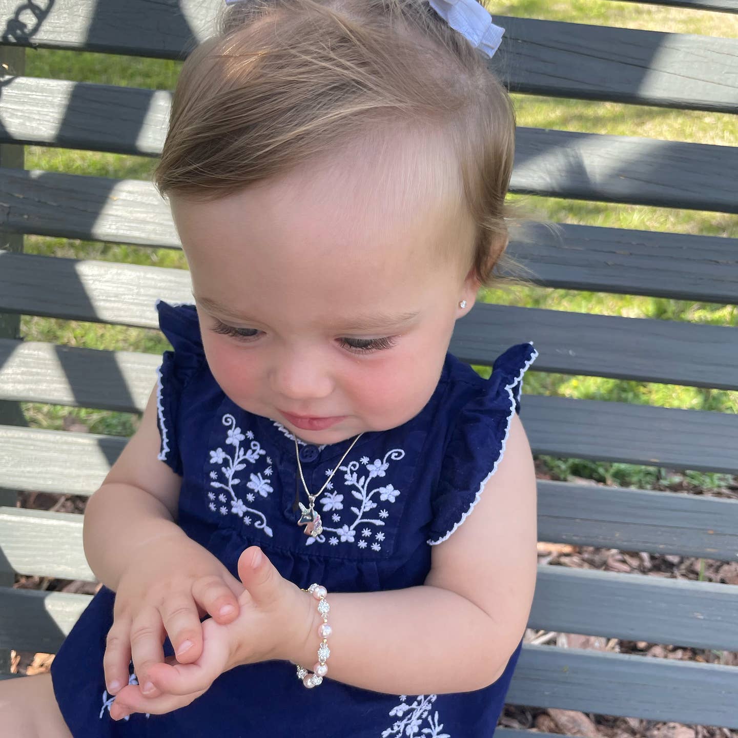 This keepsake bracelet is made with high-end pink pearls and crystals, sparkling pave beads, and sterling silver beads! This high quality bracelet has an extension chain so as the child grows you just move to the next link for a perfect fit. Available in three sizes and is great for infants, babies, toddlers, and kids. This bracelet comes in a beautiful gift box. Hand made in the USA!