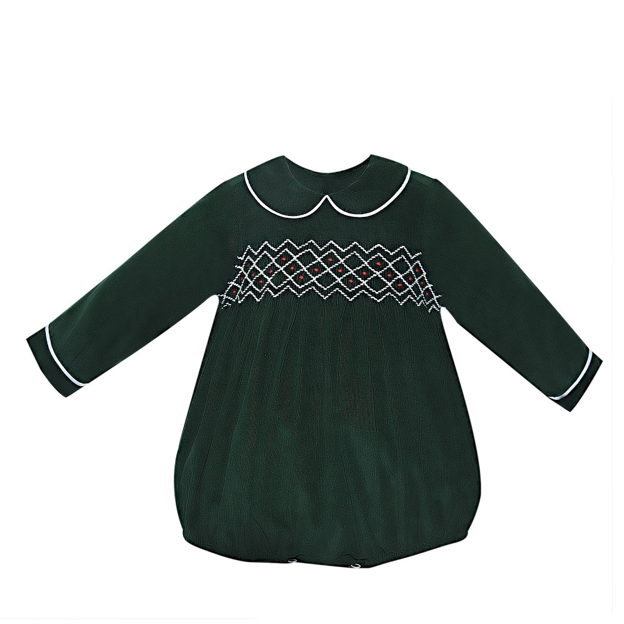 - Smocking detail on chest with hand embroidered white and red stitching