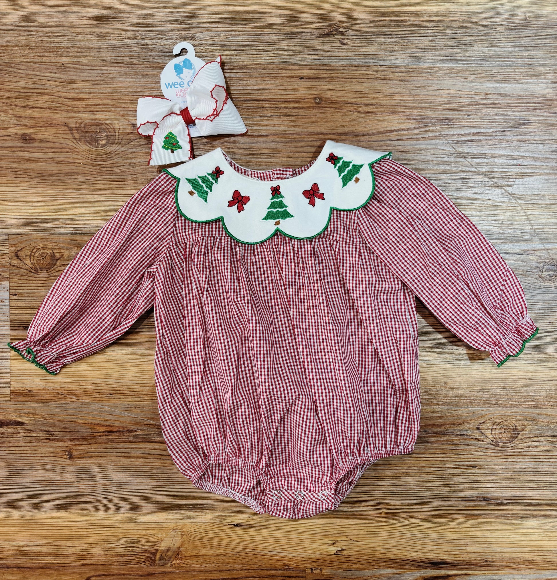 The Festive Bow & Tree Cotton Bubble features a classic long-sleeve silhouette with a gently gathered body and a charming scalloped collar, beautifully embroidered with festive tree and bow motifs. Snap closures make changes easy, while the sweet details add a touch of holiday cheer * Snap buttons. * Fits true to size. * 100% Cotton * Combo: 95% Polyester / 5% Spandex