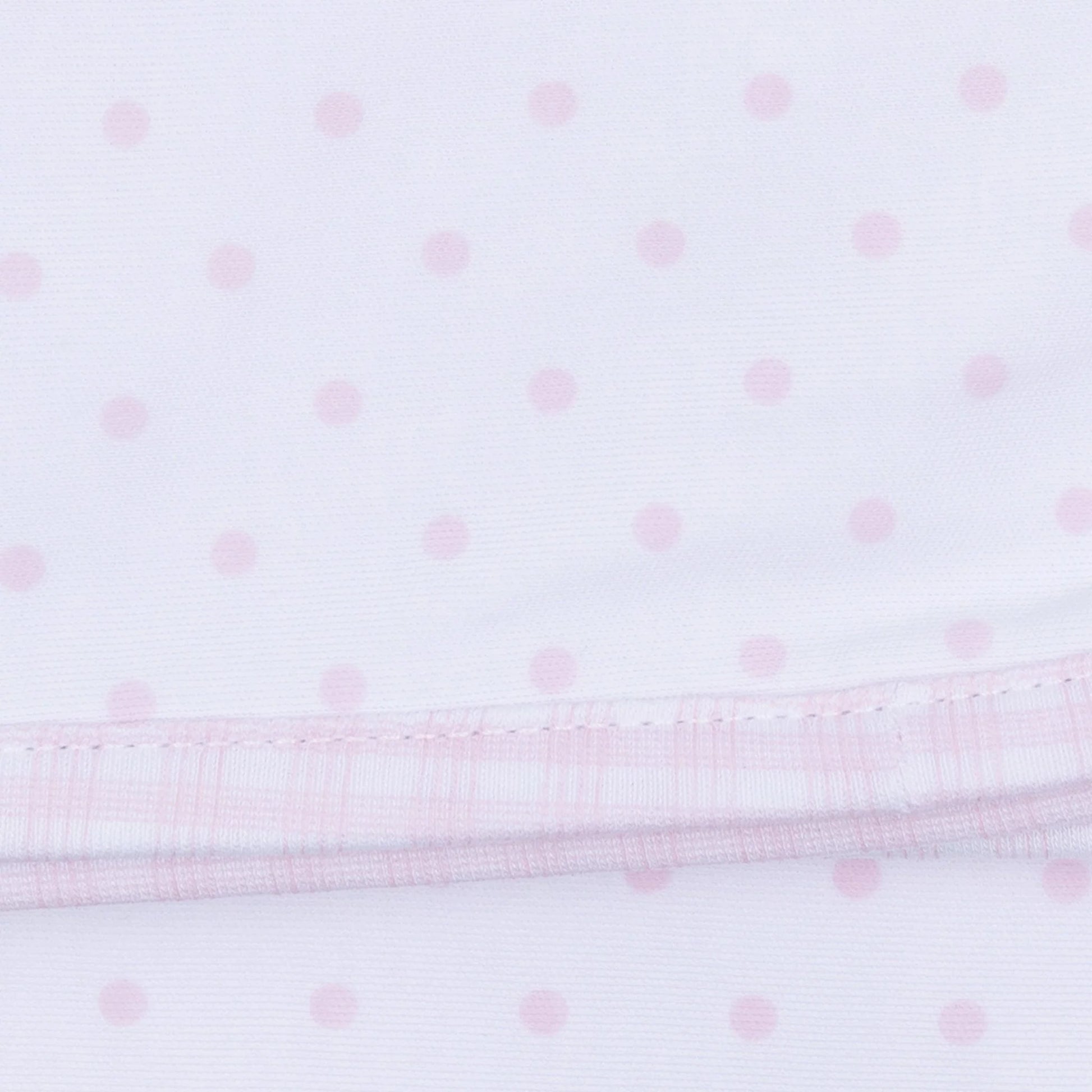 This charming bubble is a vision of sweetness. Crafted from the most luxurious Pima cotton, it's soft against your little one's delicate skin and perfect for twirling and playing. The dainty pink polka dots add a touch of whimsy, while the layered ruffles create a look of playful elegance.