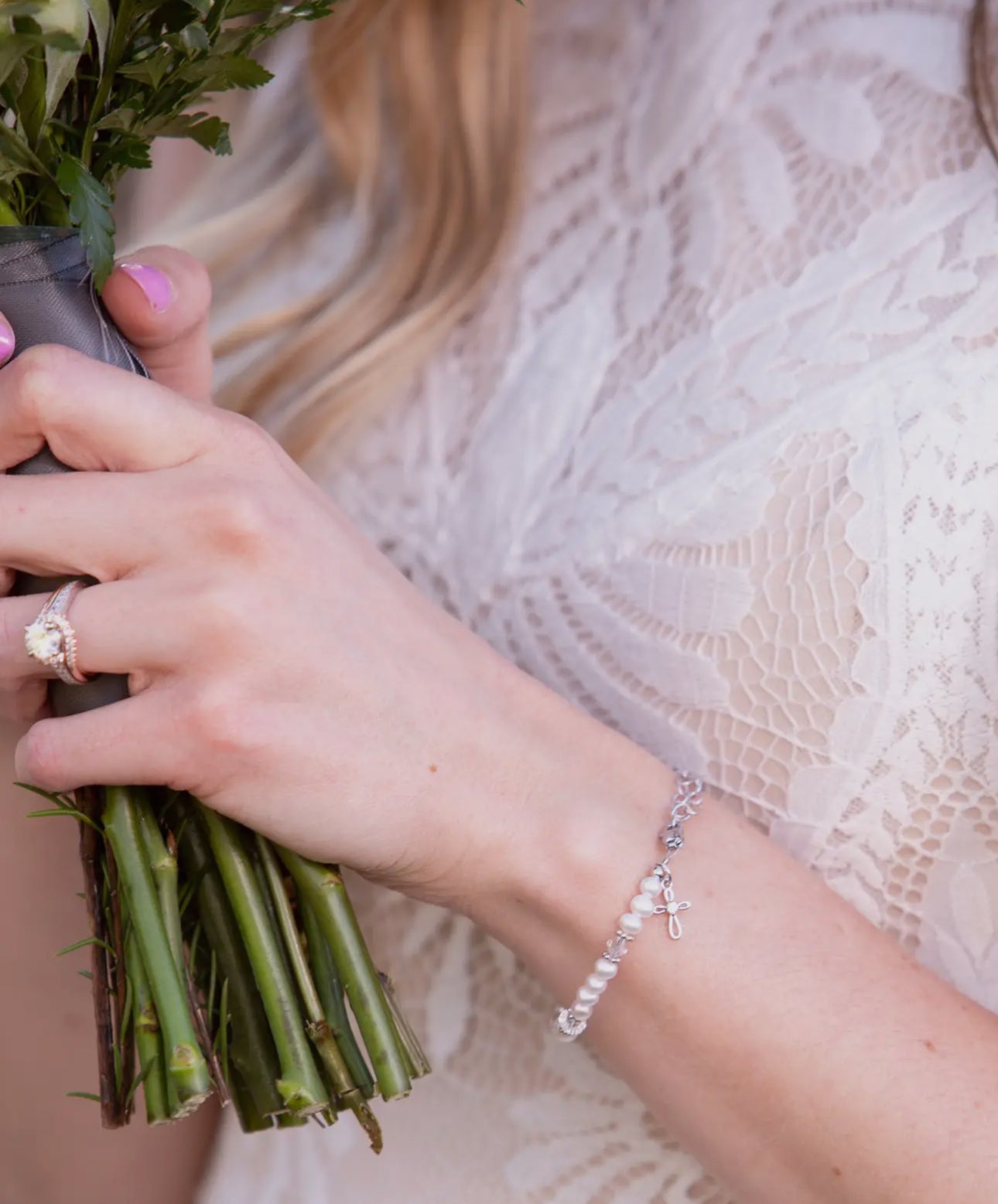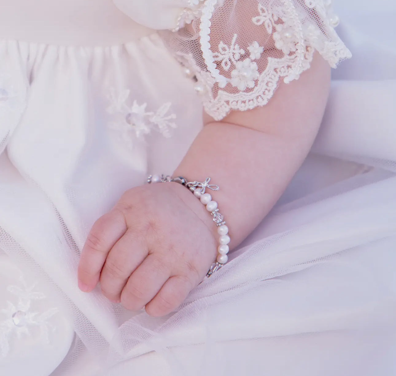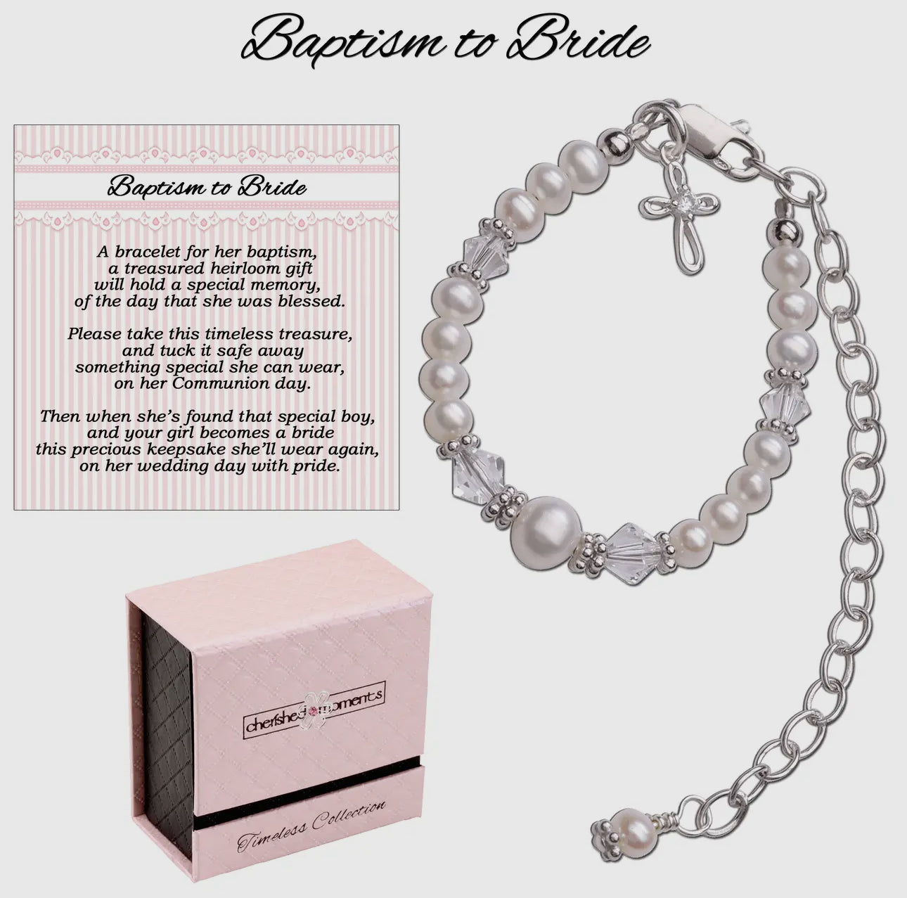From our Timeless Collection, a popular sterling silver keepsake baptism gift "Baptism to Bride" bracelet set. This special keepsake will be a treasure that can be worn on her baptism day and then cherished again when she has her first communion, and again on that special day when she becomes a bride. This is designed with .925 sterling silver, high-quality freshwater pearls, high-end crystals, and is hand-beaded here in the USA. This comes with a sweet poem and includes a place to write her name and date she was baptized with an adorable keepsake box for storing.