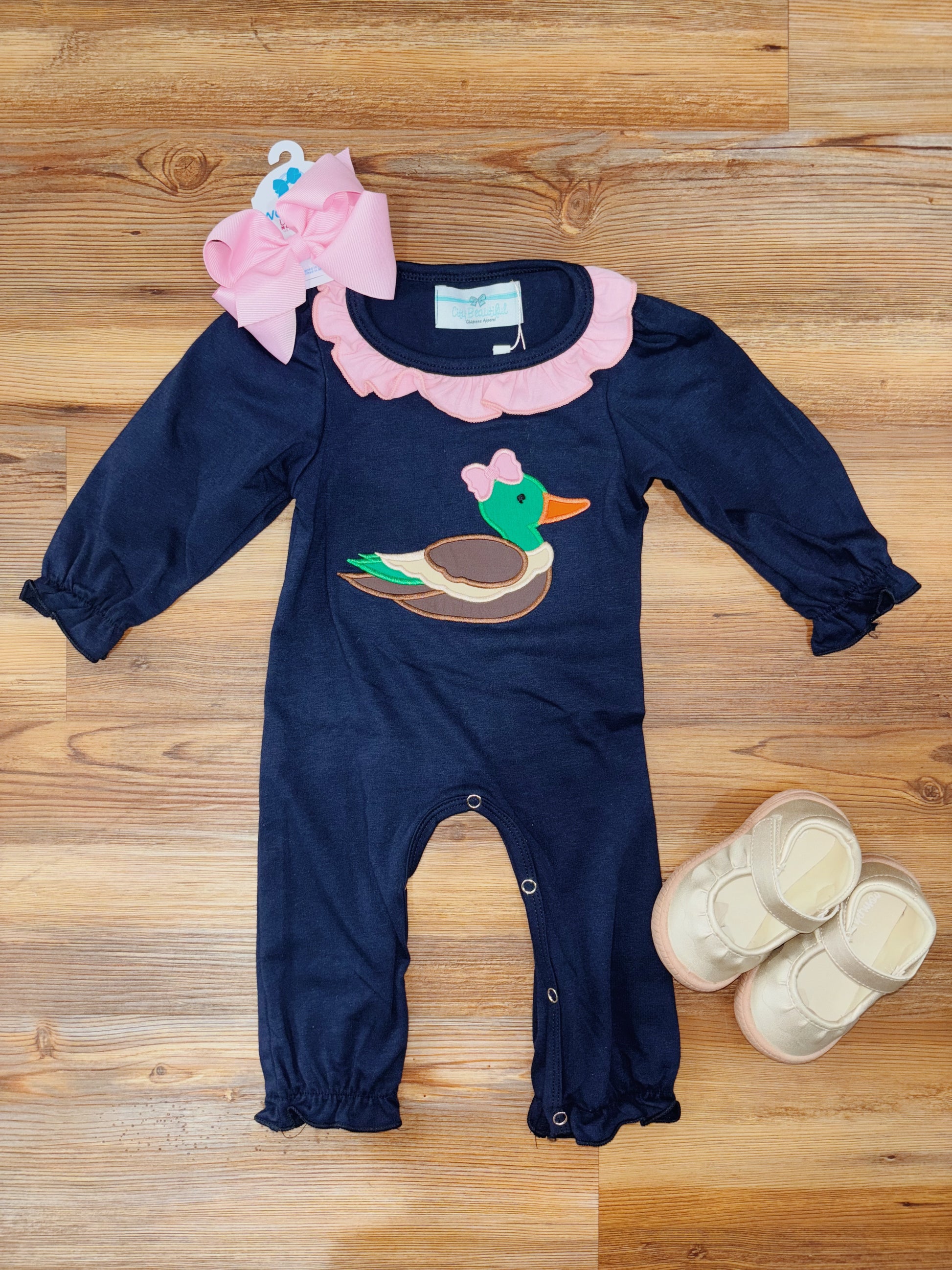 Our navy ruffle romper features a charming pink ruffle collar and an embroidered mallard duck, adding a touch of playfulness to the classic design. With convenient buttons in the crotch, this romper offers both style and functionality for your little one.