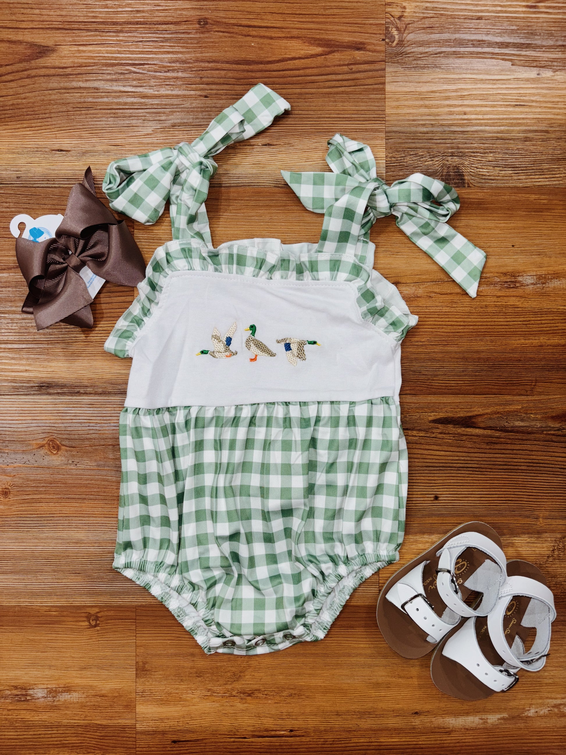 This Girls Plaid Duck Bubble is a sleeveless green plaid design with charming duck embroidery. Easy to dress with ties on the shoulders and buttons in the crotch. Perfect for warm days and casual occasions.