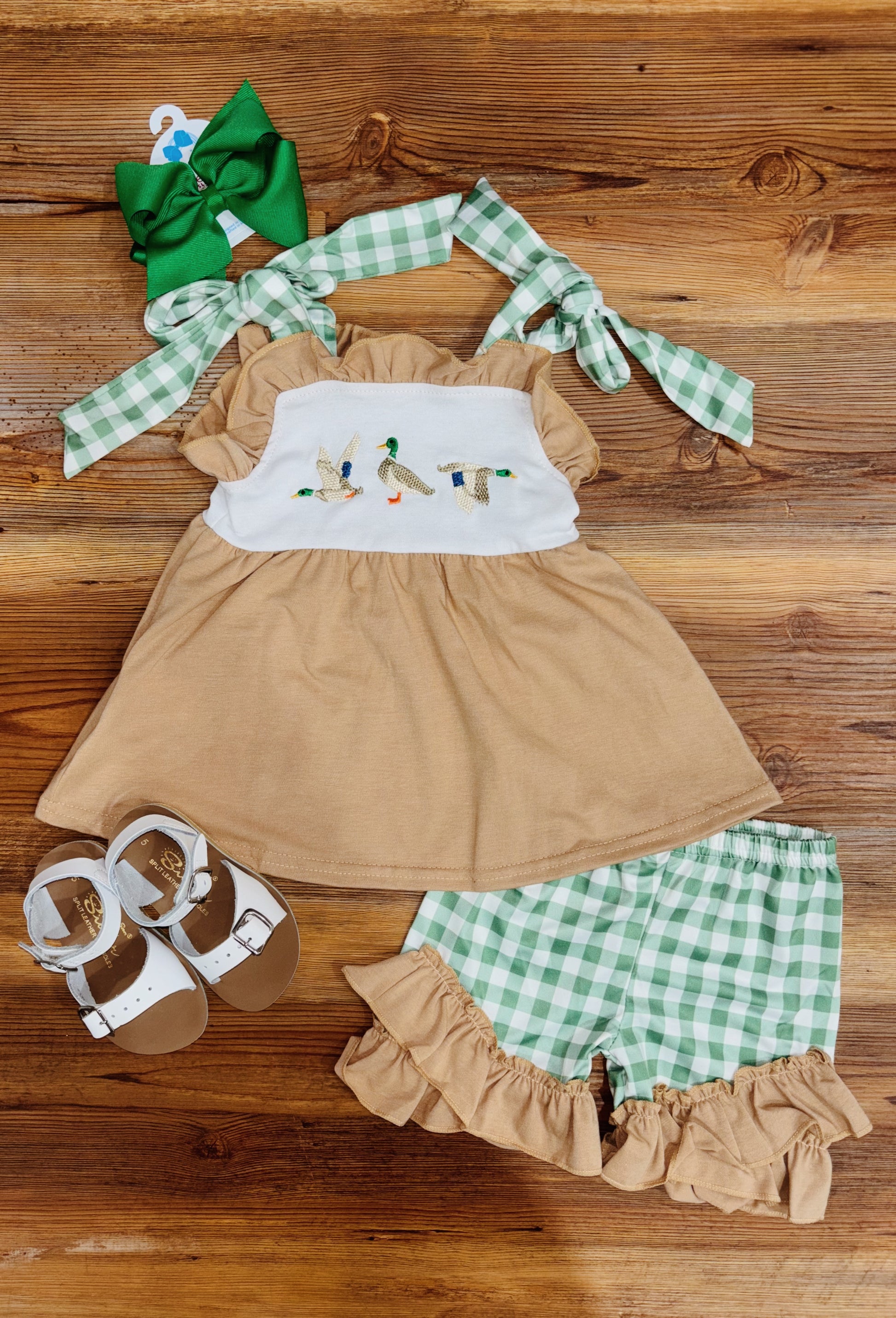 Quack into style with the Green Duck embroidery plaid girl set! This fun and playful set features a unique green duck embroidery on a classic plaid design. Perfect for the quirky fashionista who loves to stand out and make a statement. (Just don't tell the ducks they're on a shirt!)