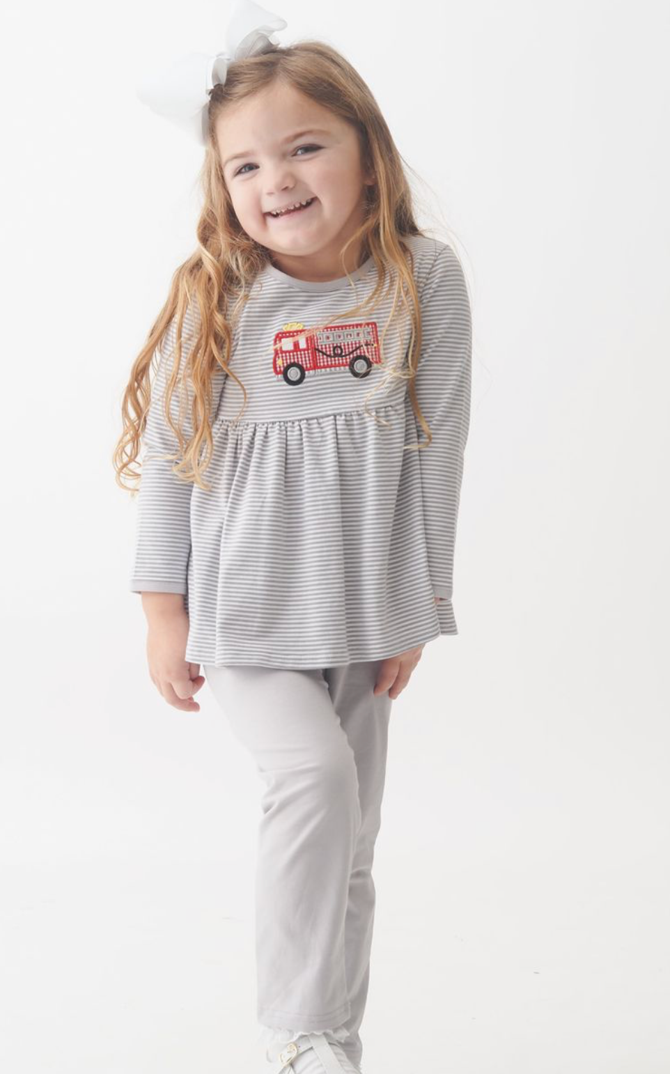 This grey striped shirt and light grey pants set features a long sleeve design and a playful fire truck appliqué. The ruffle bottom adds a touch of charm to this stylish and comfortable outfit. Perfect for any little one with a love for adventure.