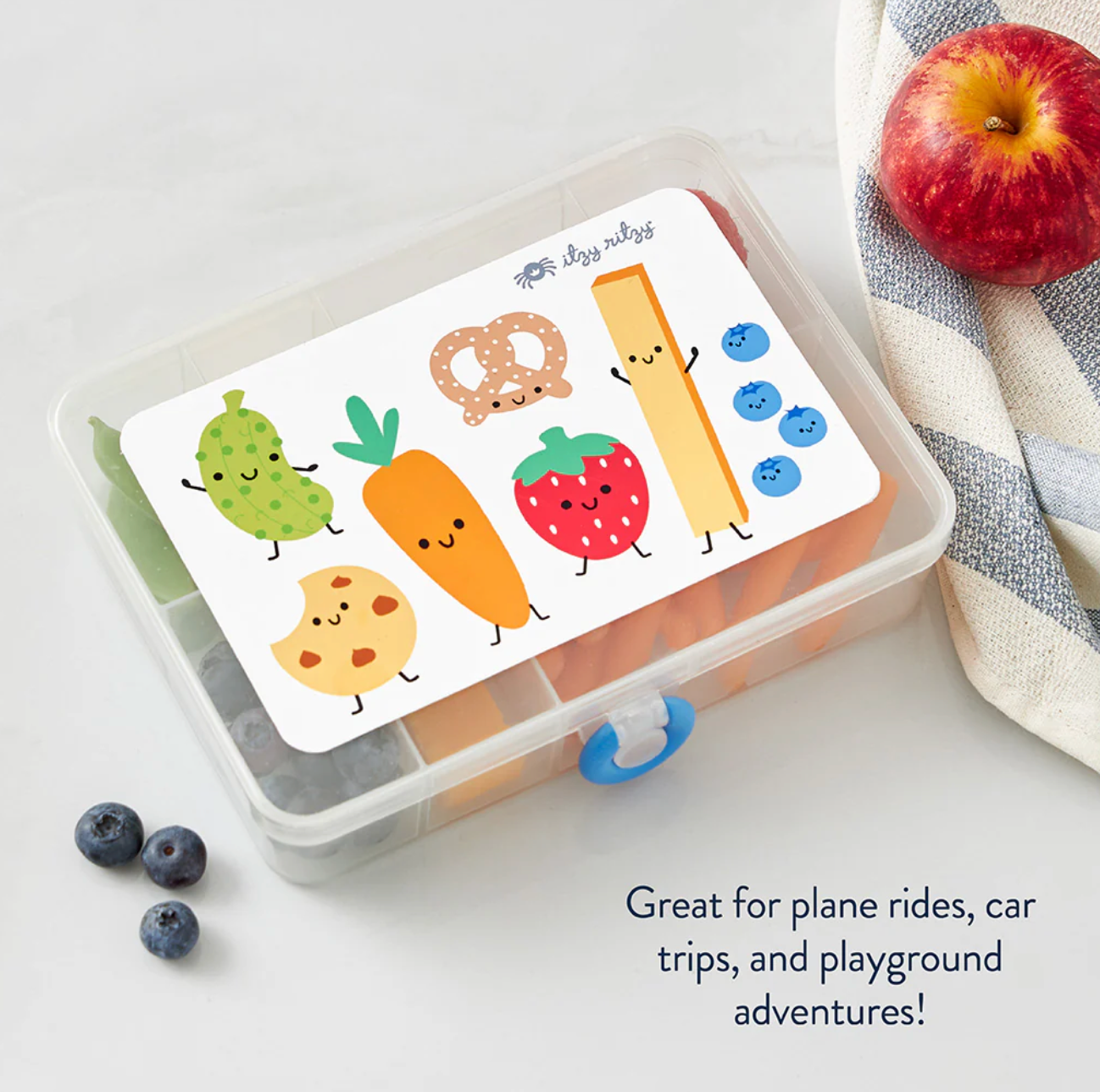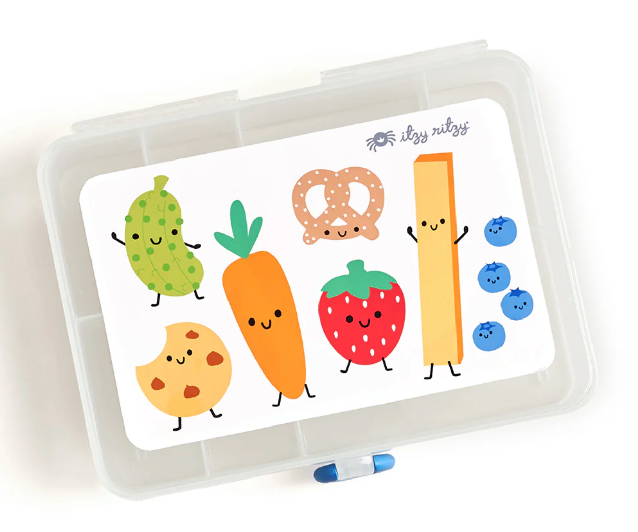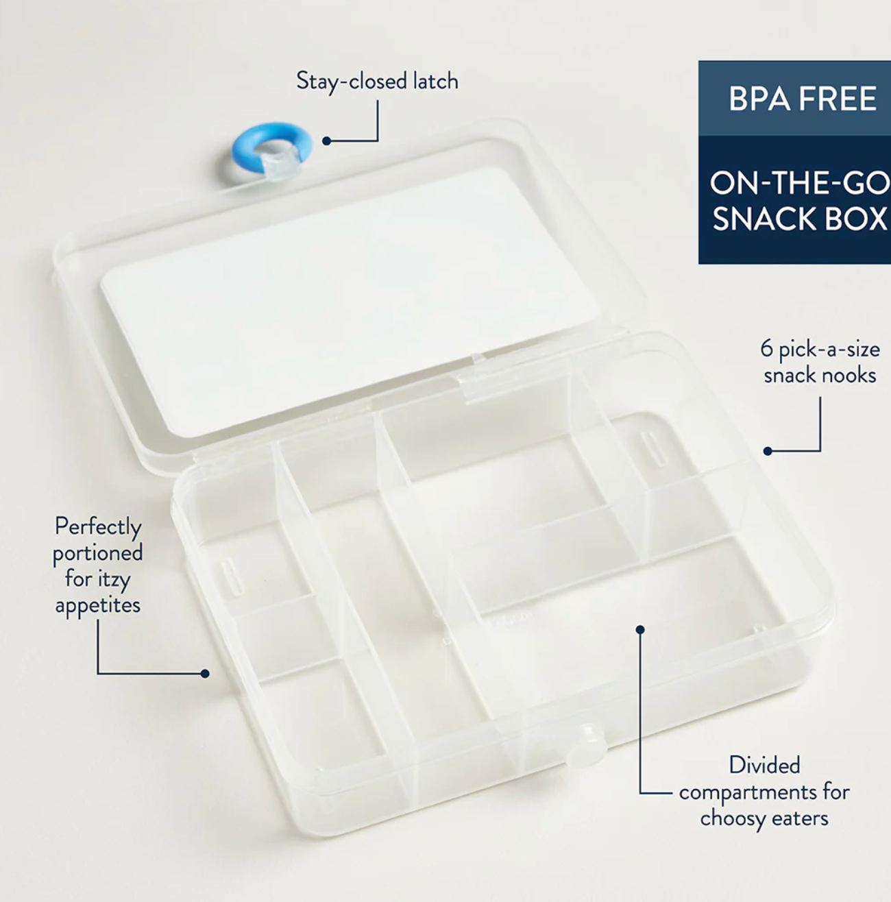 Nibble and Nosh. With six compartments, the snap-tight Itzy Snacks™ divided box separates sweet from salty and soft from crunchy for happy, independent eating. Great for plane rides, car trips, and playground adventures.