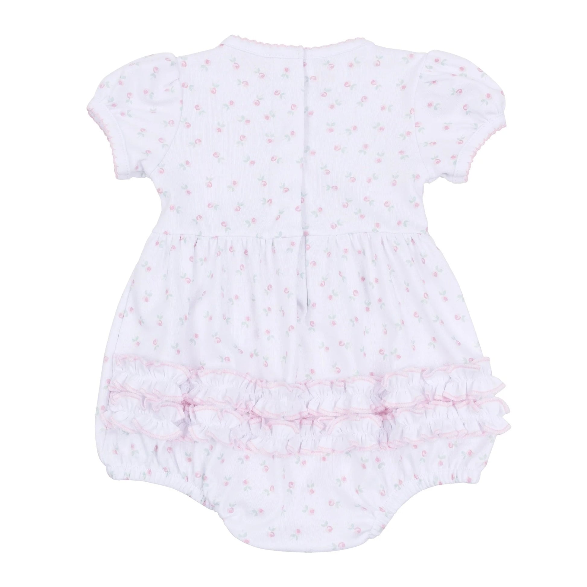 A sweet short sleeve bubble in luxurious Pima Cotton, featuring playful ruffles and an all-over tiny floral and dot print. This piece combines comfort with an adorable, classic look for warmer days.