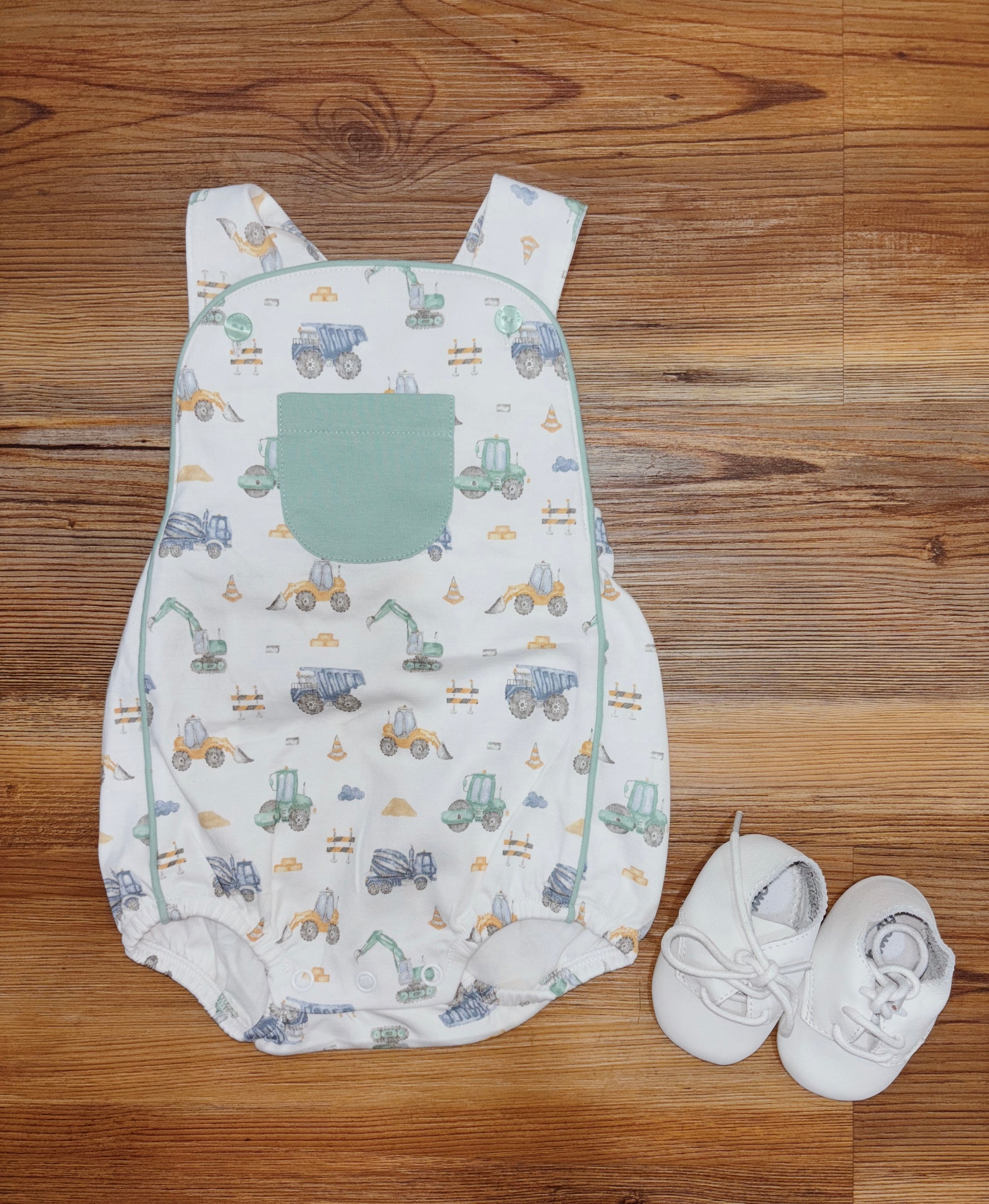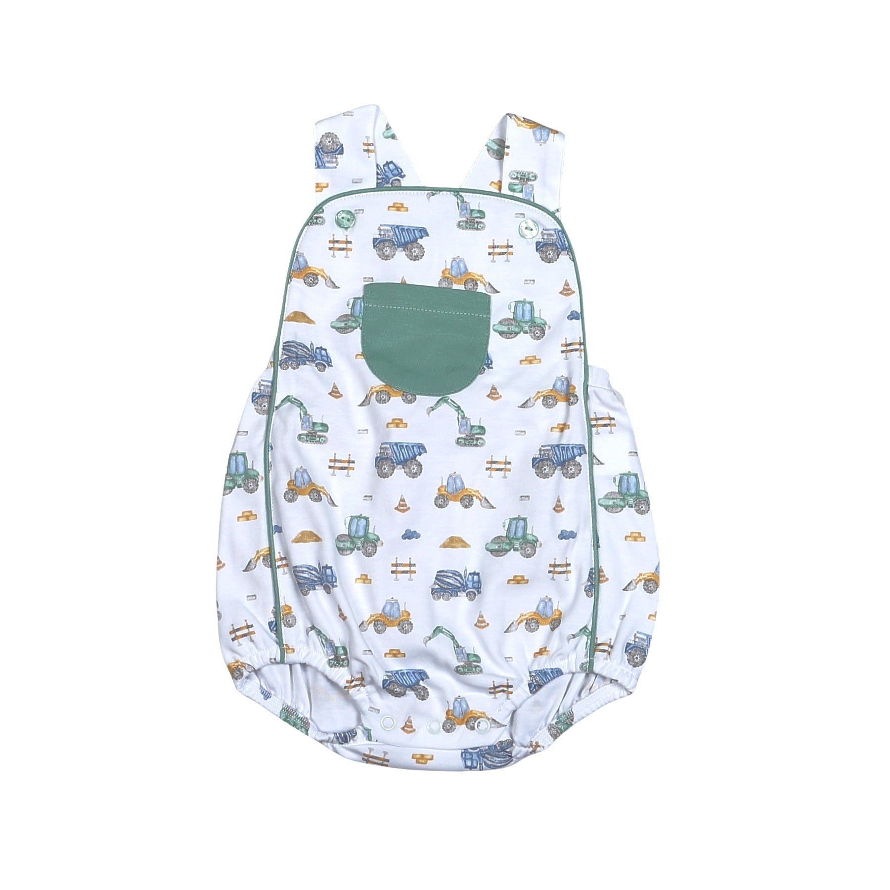 The Kidstruction Zone Pima Sun Bubble is perfect for your little builder! Made with soft pima cotton, it features a fun construction design and adds a pop of color with green piping. The pocket on the chest provides convenience while the buttons on the crotch and straps allow for easy changes. A must-have for any budding construction enthusiast!