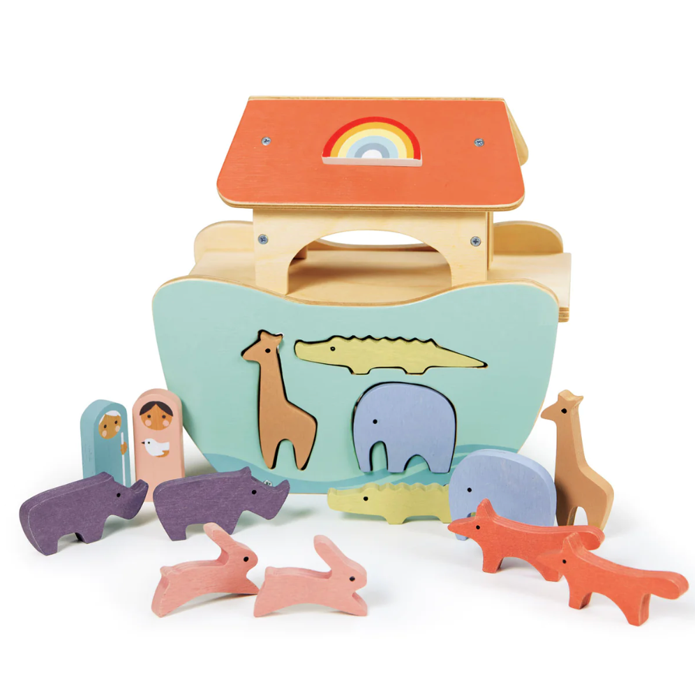 The animals went in two by two… into our Little Noah’s Ark! Our smallest, neatest shape-sorting ark with 6 pairs of solid wood animals, designed especially for little hands. Mr. and Mrs. Noah, the custodians of our animals can be placed at the top of the ark, while all the animals can be collected inside the hull and retrieved by lifting up the little house. Enjoy putting the magnetic cloud or rainbow on top of the roof.