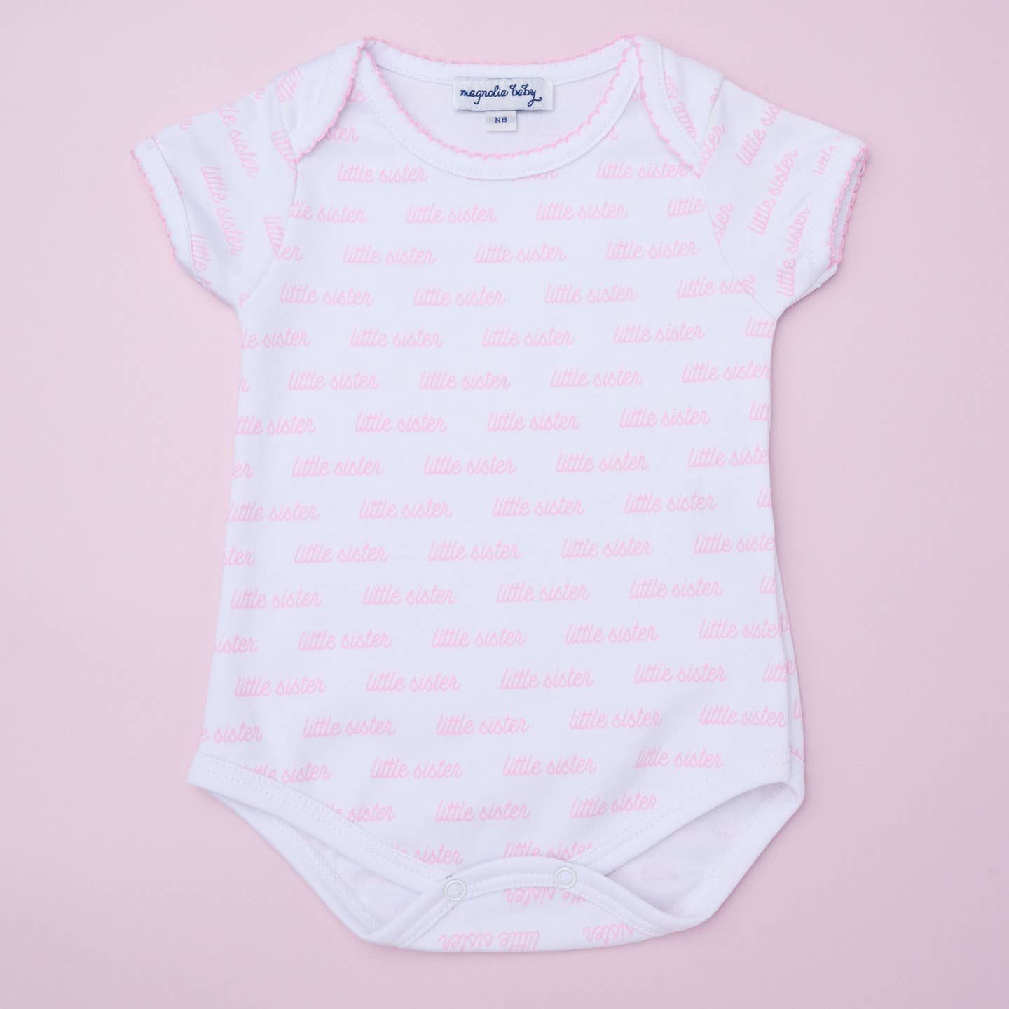 Magnolia Baby "Little Sister" Bodysuit—This adorable all-over print is perfect for baby showers or pregnancy announcements. It is made of soft Peruvian Pima cotton