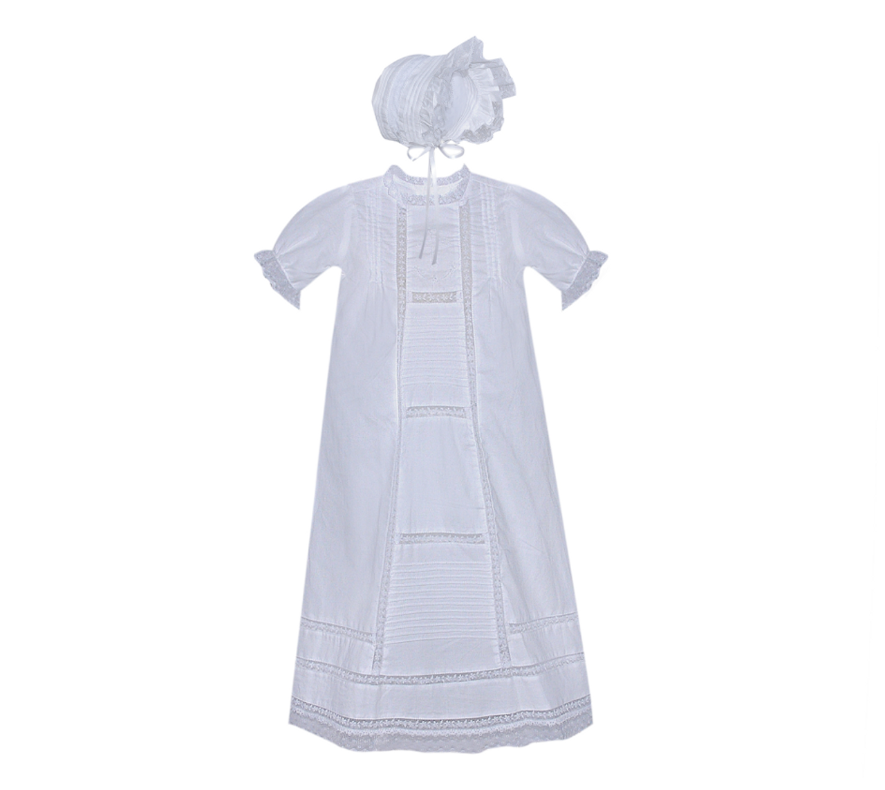This Logan Christening Gown is perfect for your special day. Made with delicate lace and adorned with ruffles and a white ribbon detail, it exudes elegance and charm. The matching bonnet completes the look, while buttons on the back neck add convenience for dressing.