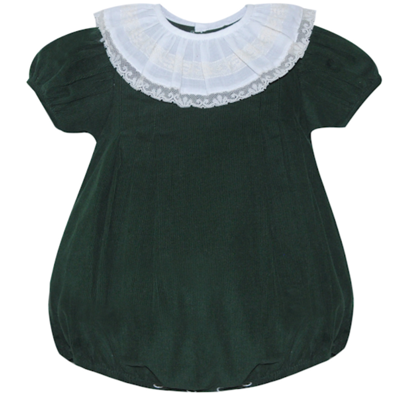 Introducing our Louise Bubble, the perfect addition to your little one's holiday wardrobe. Made from soft corduroy in a festive Christmas green, it features a delicate white lace collar and button closures in the back and crotch for easy dressing. Give your child the gift of comfort and style this holiday season.