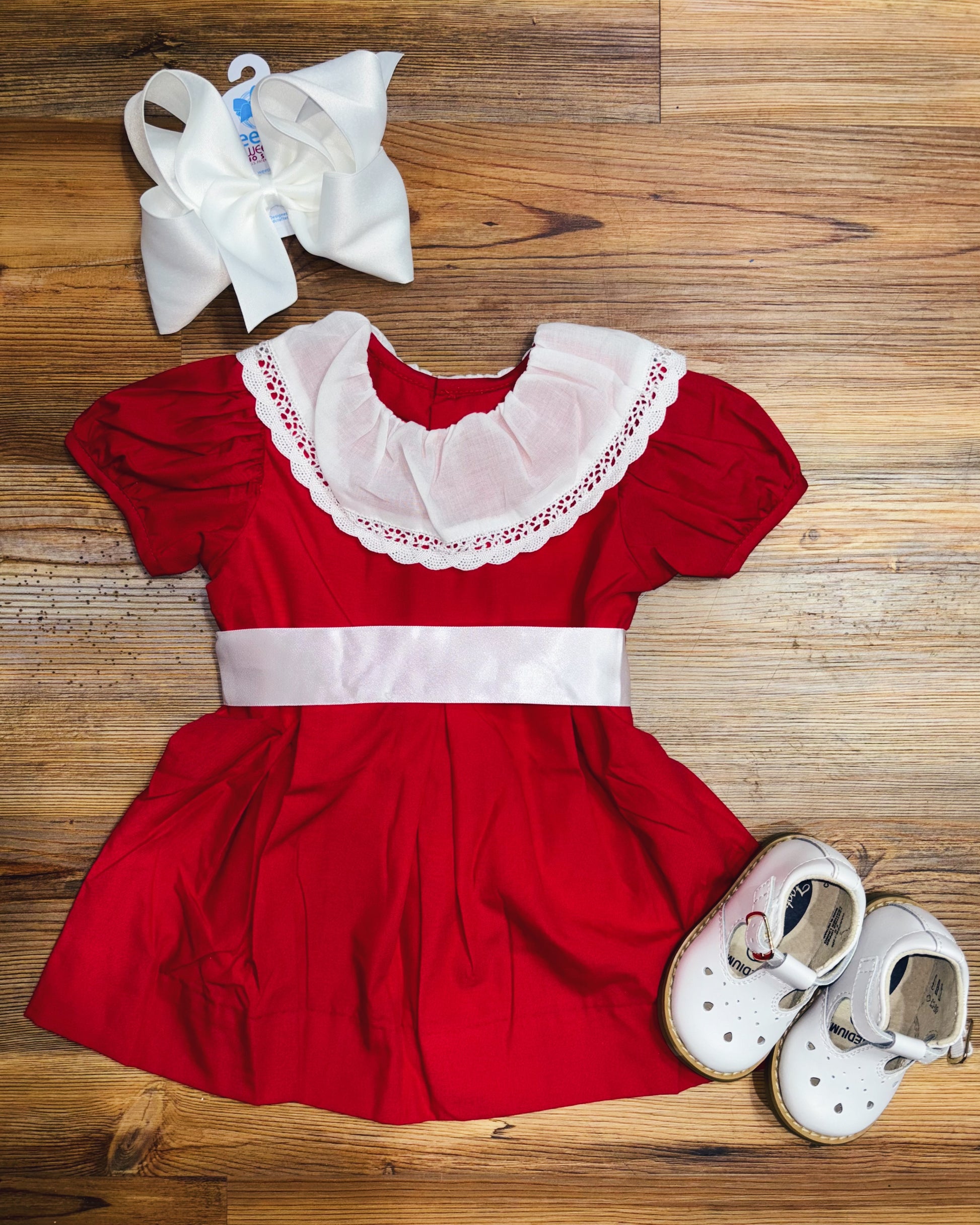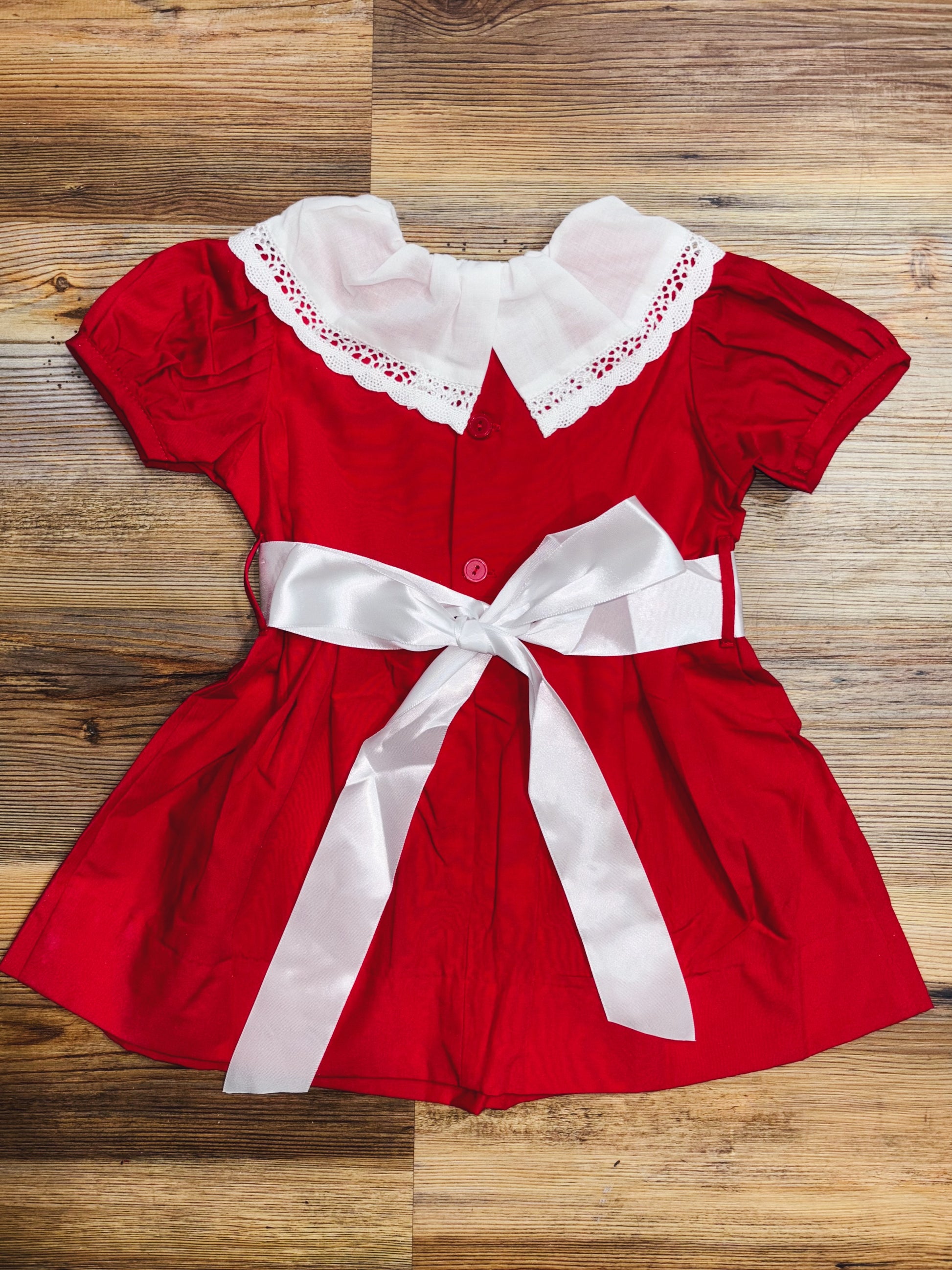 This adorable red dress with white color and lace trim with satin bow around the waist is ready for anything from formal pictures to a party. She will be a vision in the Kennedy Maize.