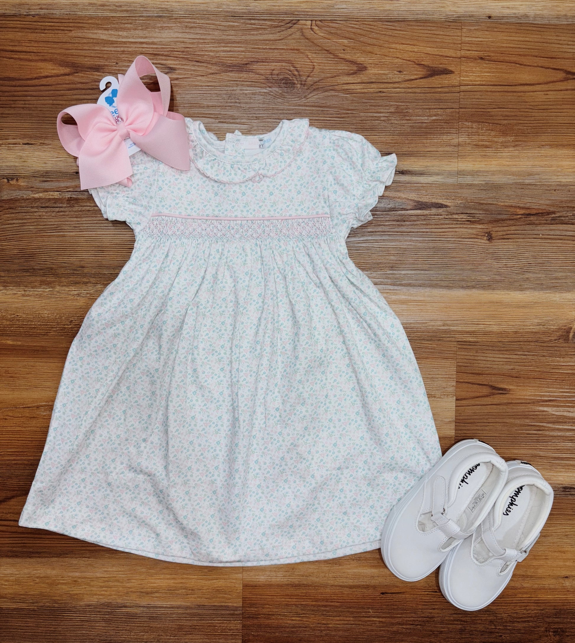 Expertly hand-smocked and perfectly playful, our Mini Floral Smock Pima Dress features a beautiful blue floral pattern, charming ruffle sleeves and collar, and functional buttons in the back. Made with soft Pima cotton, this dress is as comfortable as it is adorable.