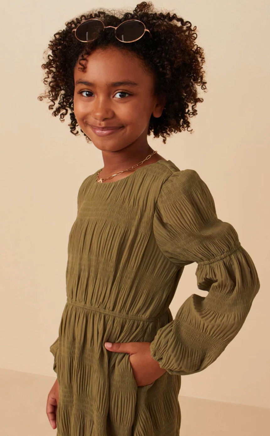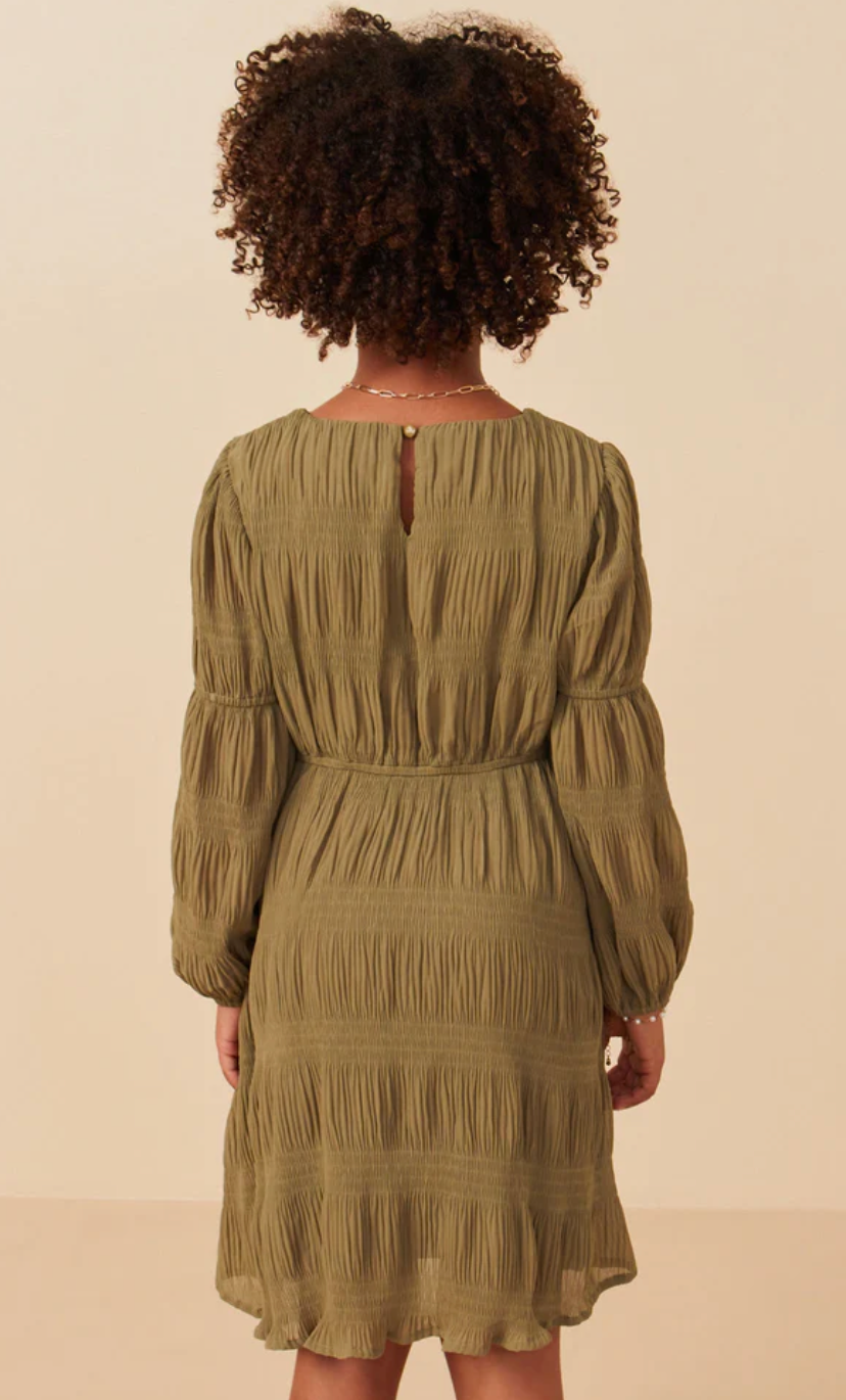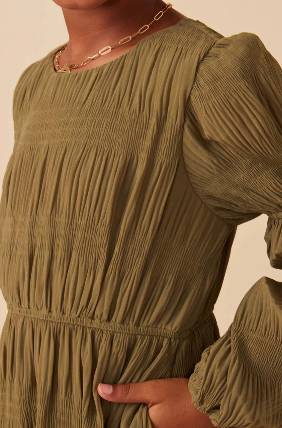 Our Mixed Pleated Peasant Sleeve Dress Features: