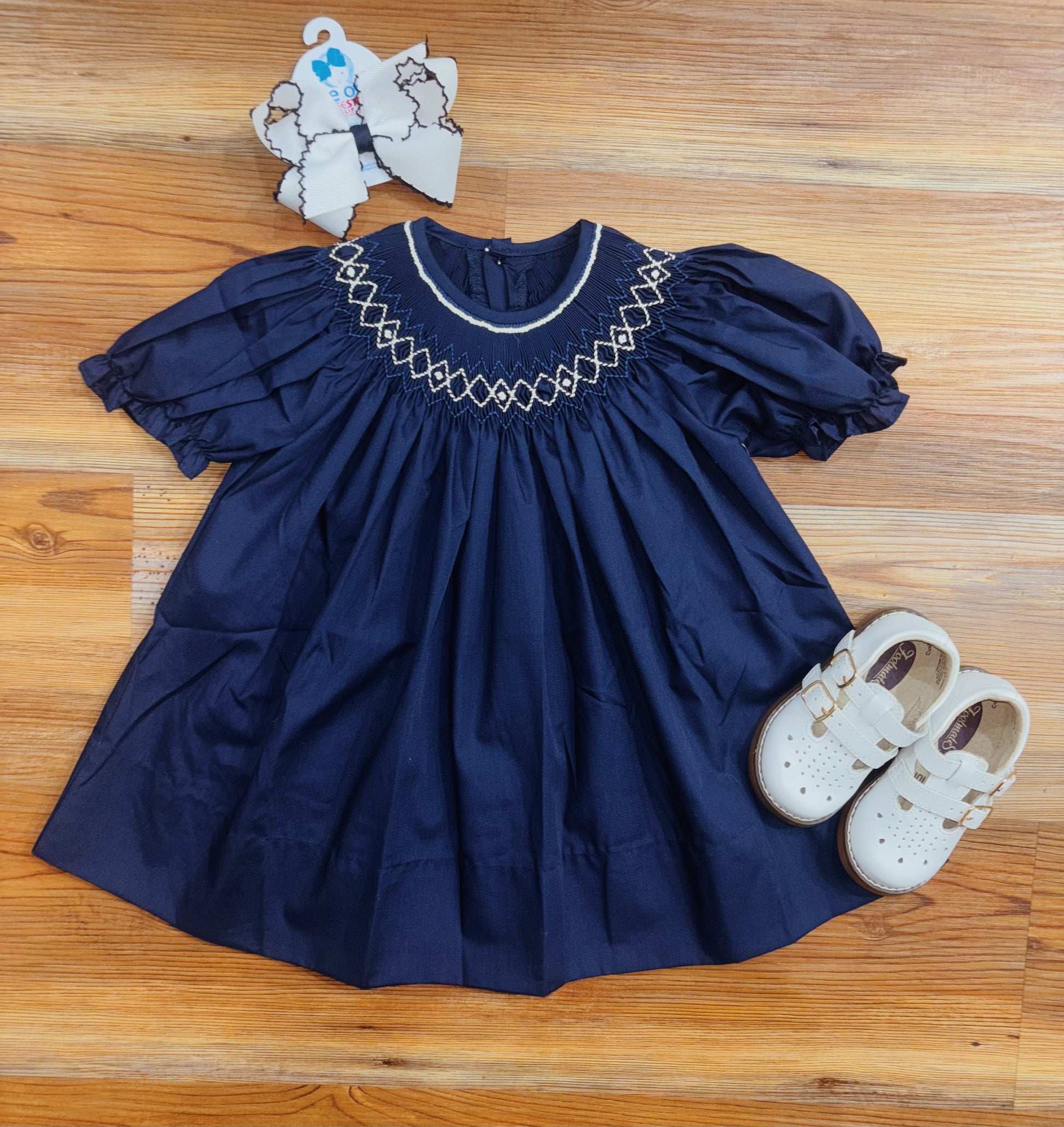 This navy bishop dress is a perfect winter option for girls. Its smocked collar adds a touch of elegance while its buttons on the back make it easy to dress and undress. Made with high-quality fabric, this dress will keep your little one warm and stylish.