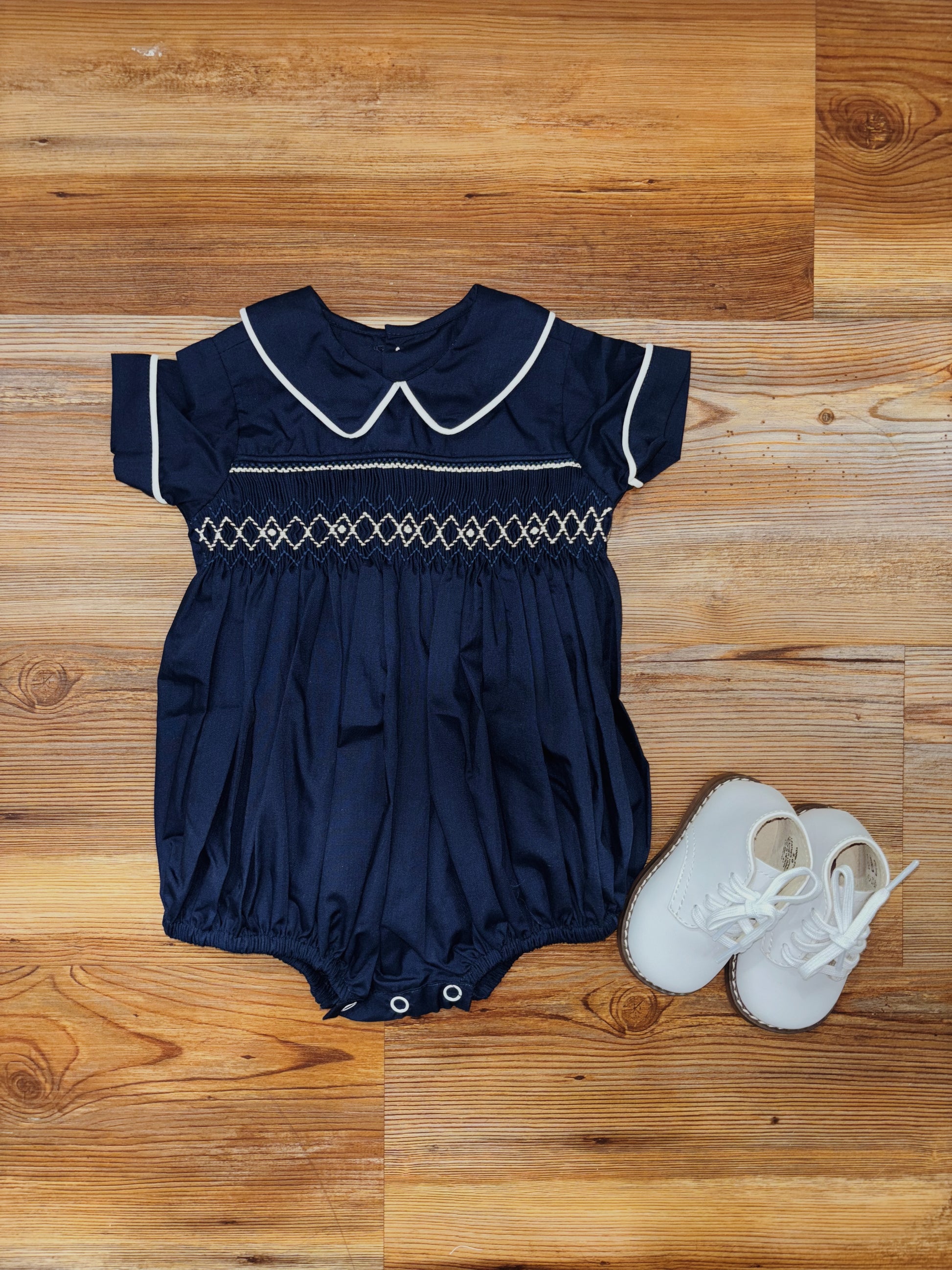 This navy bubble is perfect for boys during the winter season. With a smocked design and short sleeves, it offers both style and comfort. The buttons in the crotch and back make it easy to put on and take off, making it a practical choice for parents.