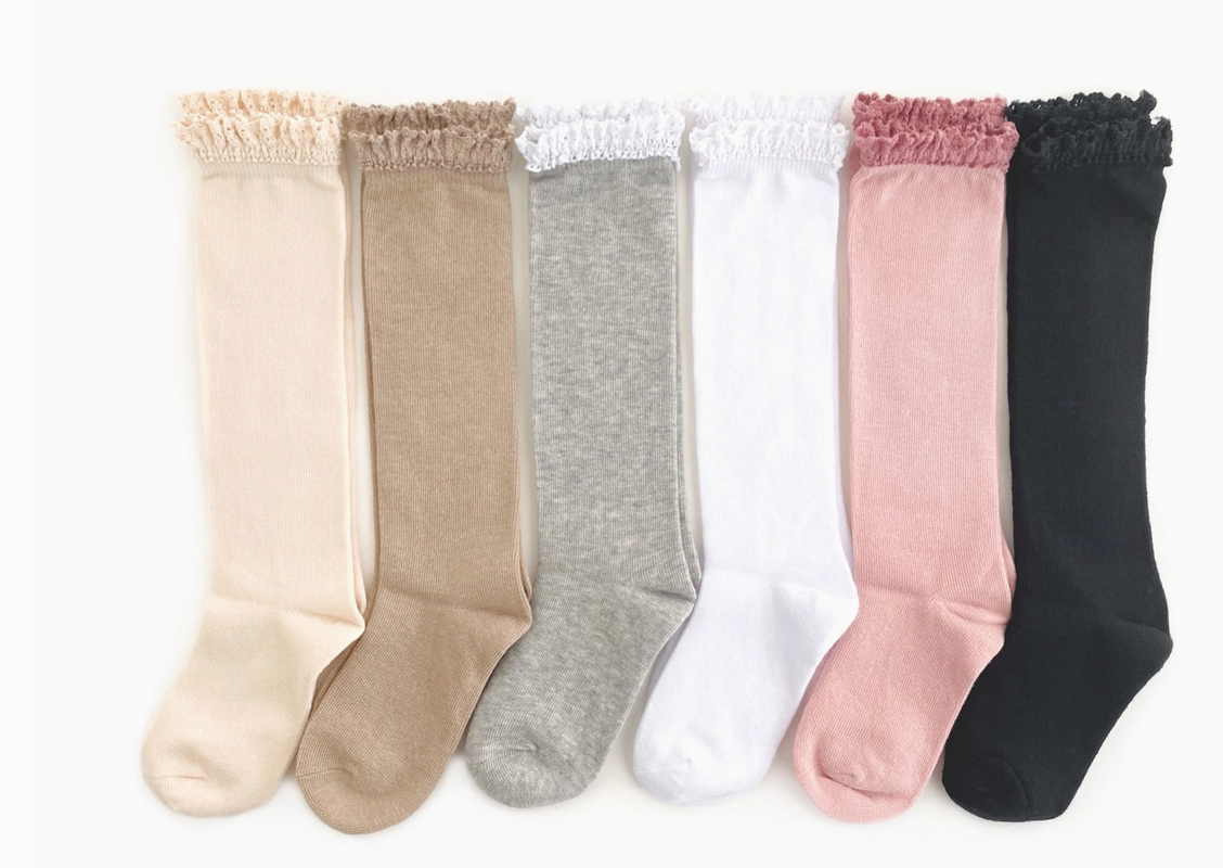 Basics + Neutrals Bundle of Lace Top Knee Highs for babies, toddlers and girls! This 6 pair bundle includes one pair each of colors Vanilla, Oat, Gray, White, Blush and Black.