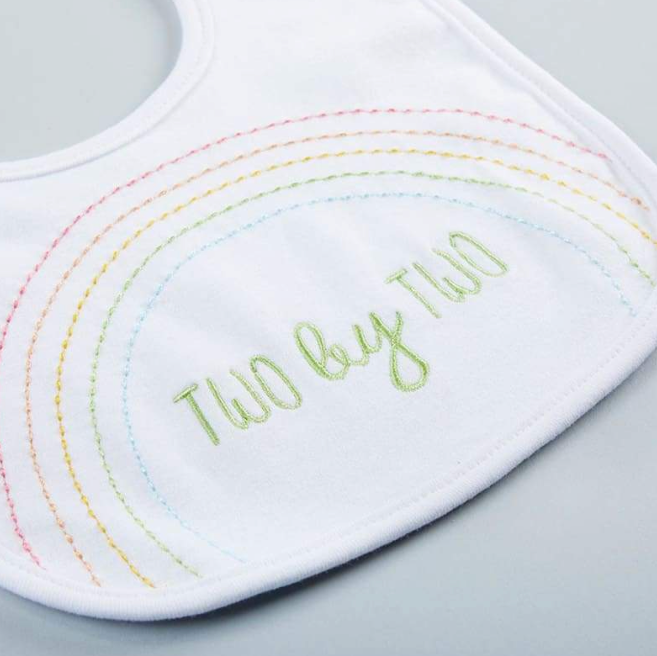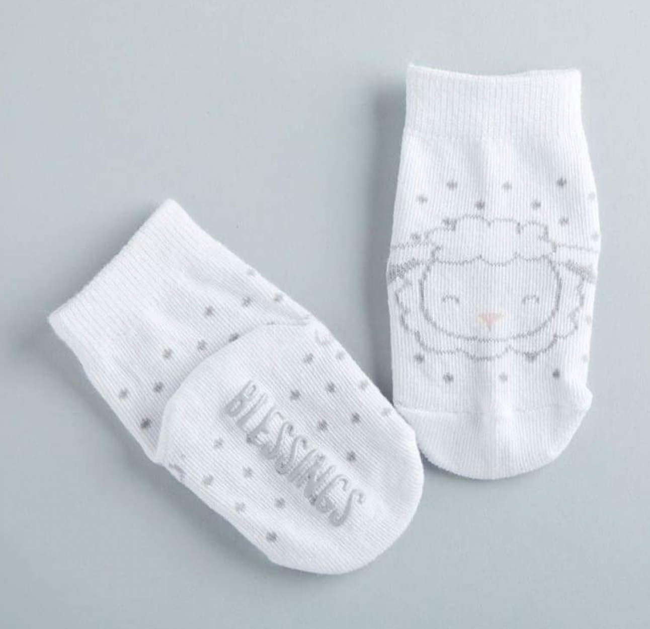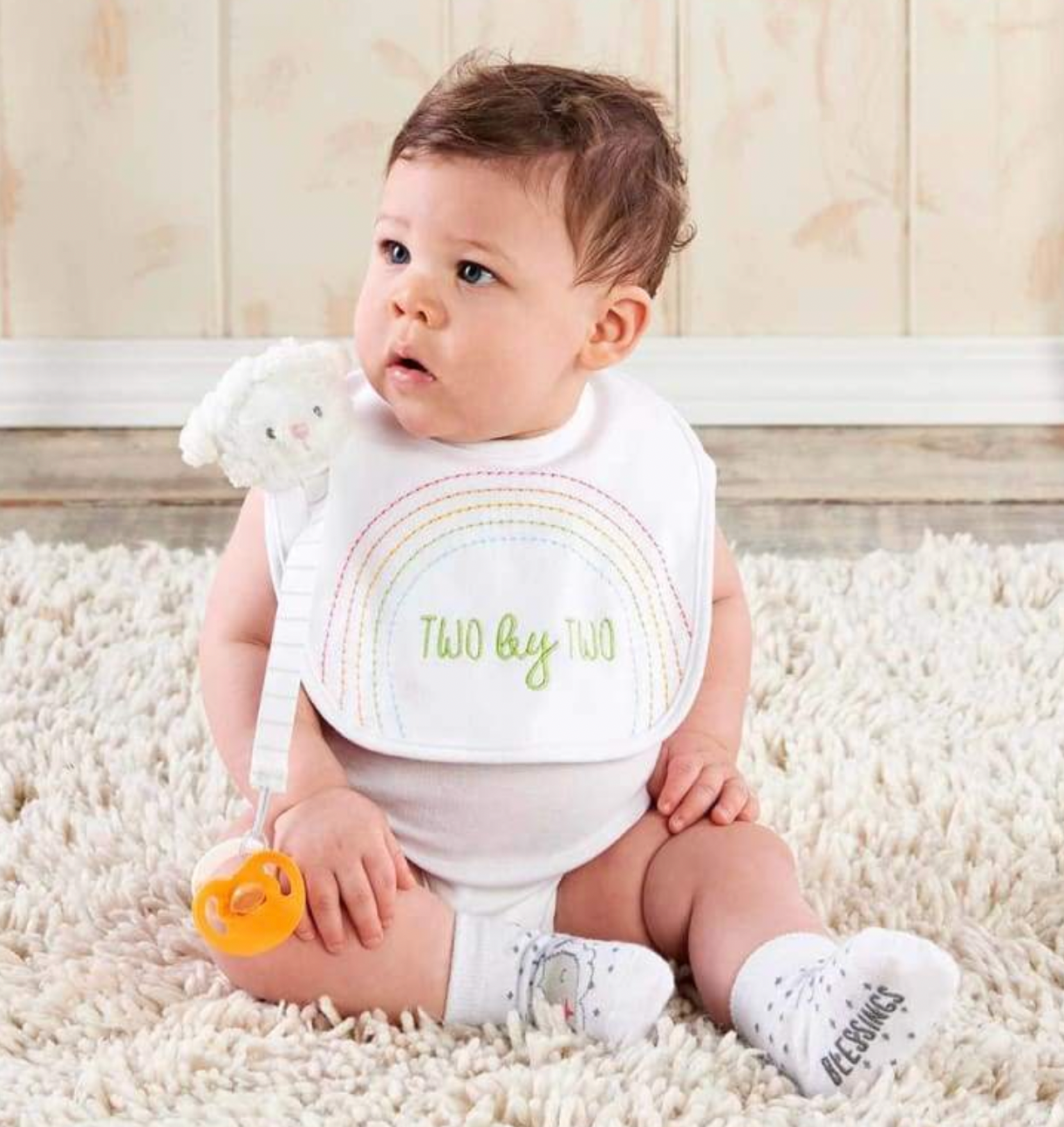 - The gender neutral Noah's Ark 3-Piece Gift Set includes 1 white cotton interlock bib with embroidered rainbow and the words, "two by two", 1 pair of white knit socks with lamb face on front and 1 fluffy piled lamb head paci-clip.