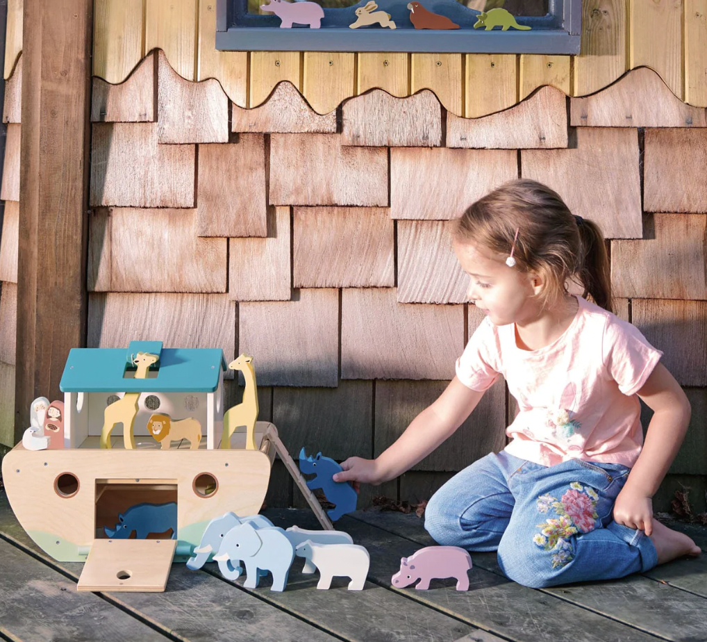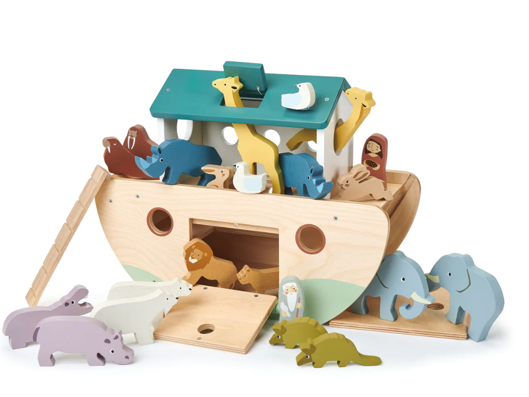 The ark has a wide opening door on one side as well as a top hatch that lifts to reveal a double-deck interior. One end slides out to allow easy access to all the animals, and a ladder makes it easy for them to climb in two by two. There is even a small window in the roof for those tall giraffes! Mr. and Mrs. Noah have collected 10 pairs of animals, can you tell which are the boys and the girls?