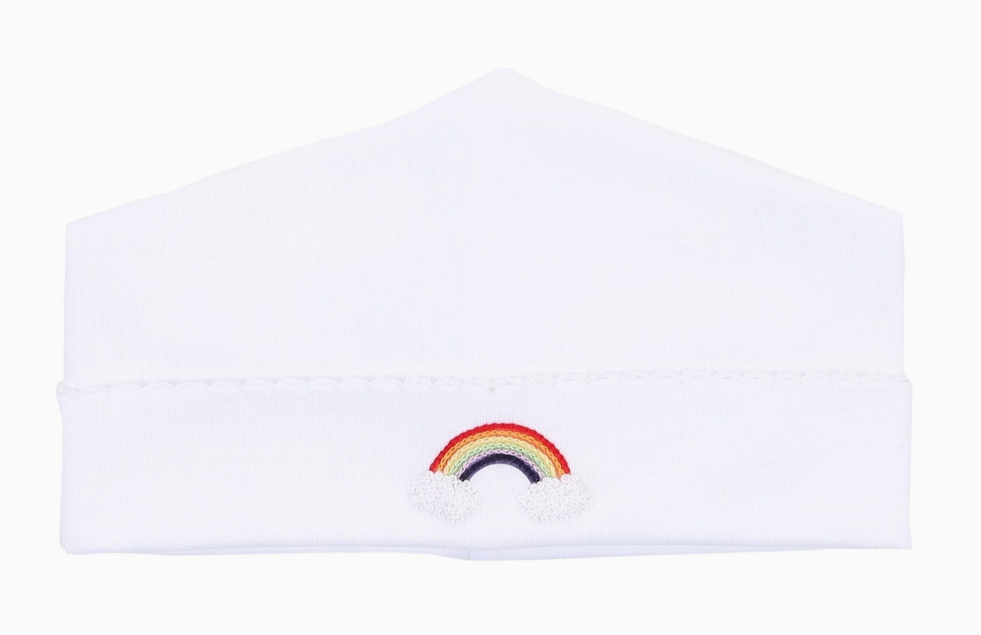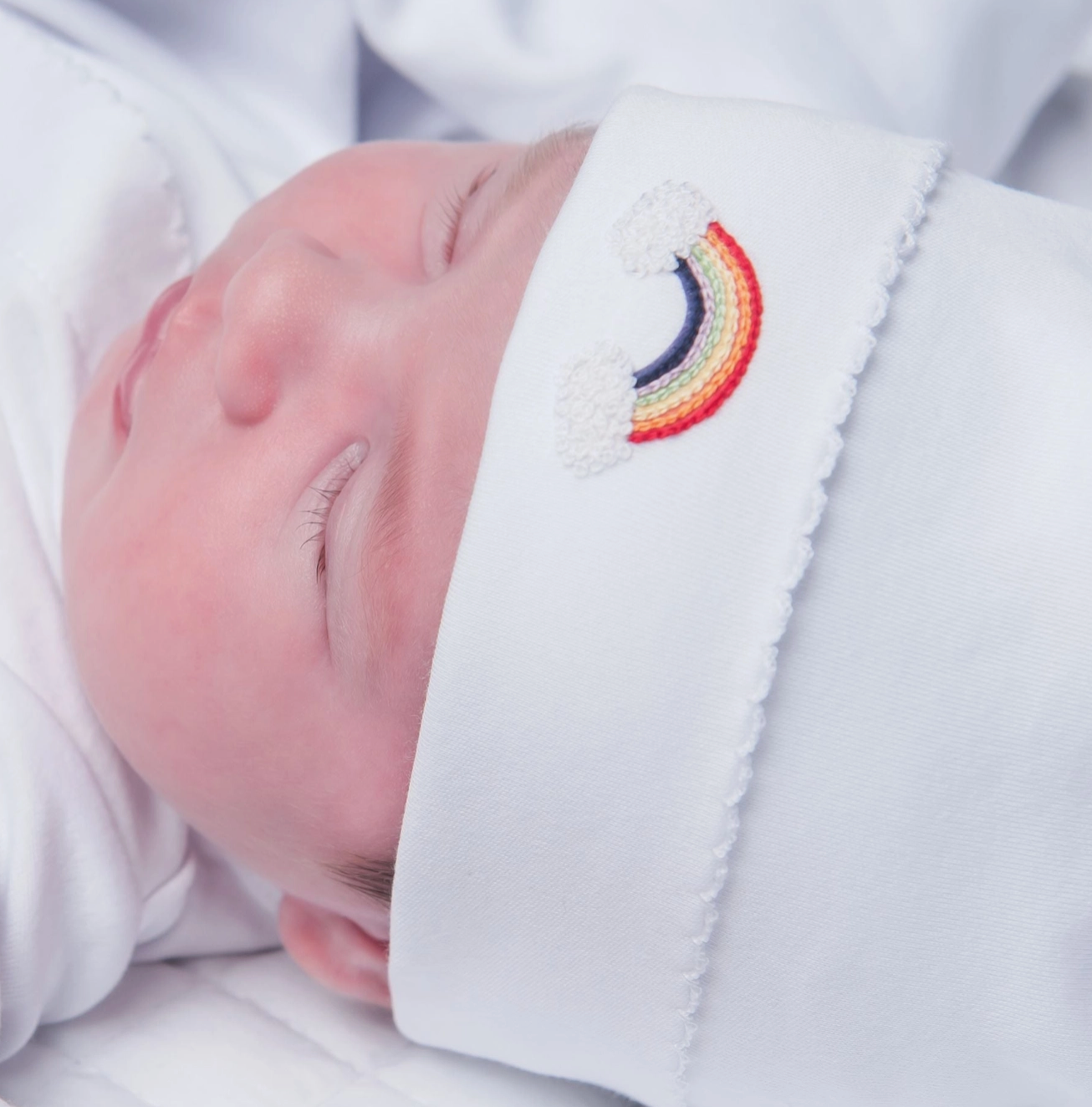 Crown your little miracle with hope and joy in Magnolia Baby's Rainbow Hat. This luxuriously soft hat, crafted from 100% pima cotton, keeps your baby warm and cozy. It features a charming, hand-embroidered rainbow - a beautiful symbol of love and new beginnings after loss. The perfect way to celebrate your precious rainbow baby, this hat also makes a heartwarming and meaningful newborn gift. Experience the ultimate comfort, symbolism, and Magnolia Baby's renowned quality with this special piece. * Coordinates with other items in the Our Rainbow Baby Collection * Hand Embroidered * 100% Pima Cotton * Made in Peru * Machine Washable