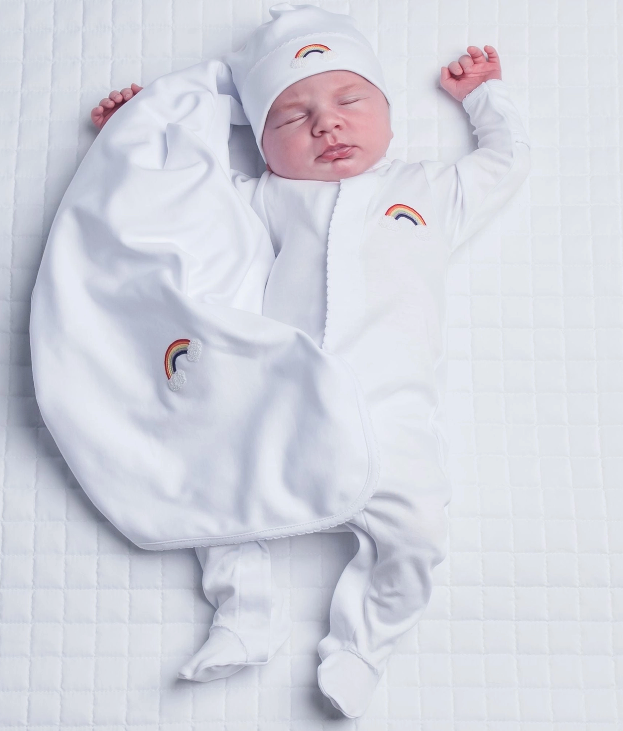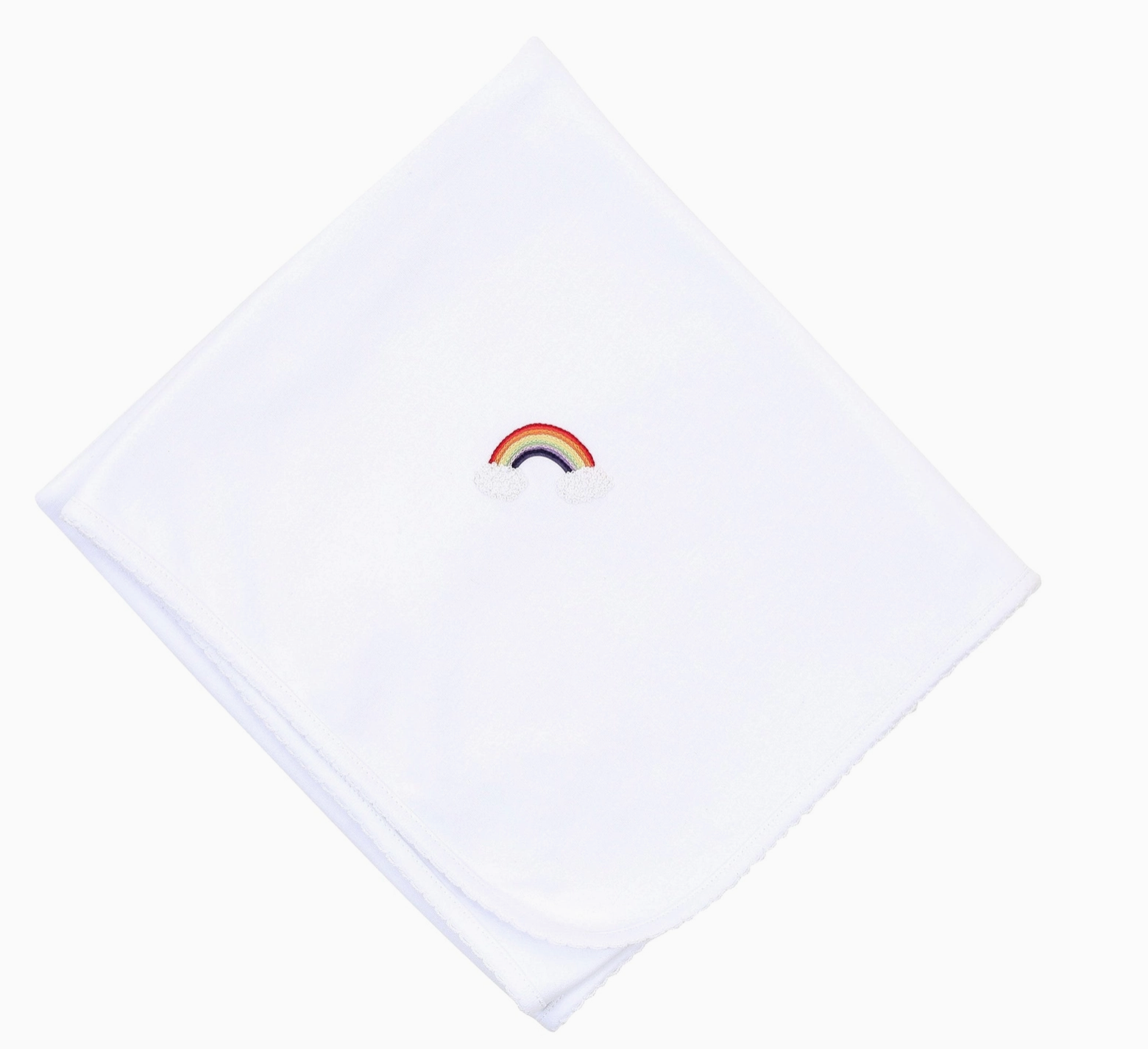 Cuddle your rainbow baby in love and hope with Magnolia Baby's Rainbow Baby Blanket. This luxuriously soft blanket, crafted from 100% pima cotton, features a charming, hand-embroidered rainbow - a beautiful symbol of joy and new beginnings after loss. The perfect way to celebrate your precious arrival, offer a meaningful newborn gift, or capture those special first moments with a blanket filled with love and symbolism. Experience the ultimate comfort and exquisite quality of Magnolia Baby with this heartwarming blanket. * Coordinates with other items in the Our Rainbow Baby Collection * Hand Embroidered * 100% Pima Cotton * Made in Peru * Machine Washable