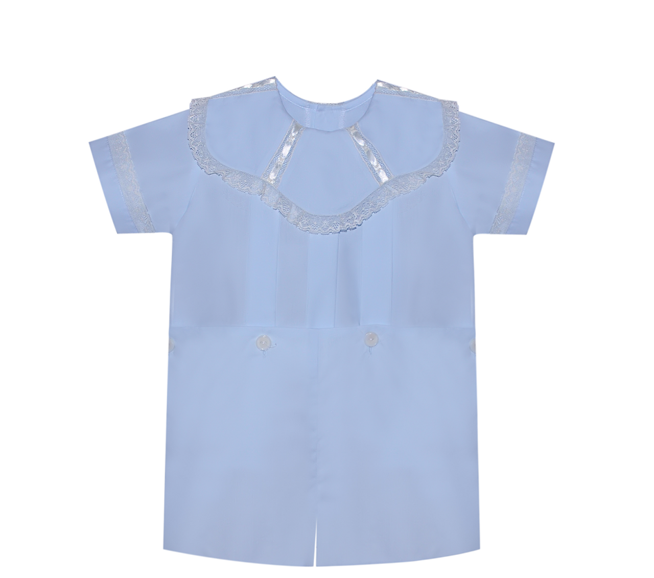 Expertly tailored with a classic paisley button on the suit, this blue lace collar set exudes sophistication. Functional buttons on the back and in the crotch ensure a secure fit, while buttons around the waist effortlessly attach the shorts to the shirt. Elevate your style with this versatile and polished ensemble.