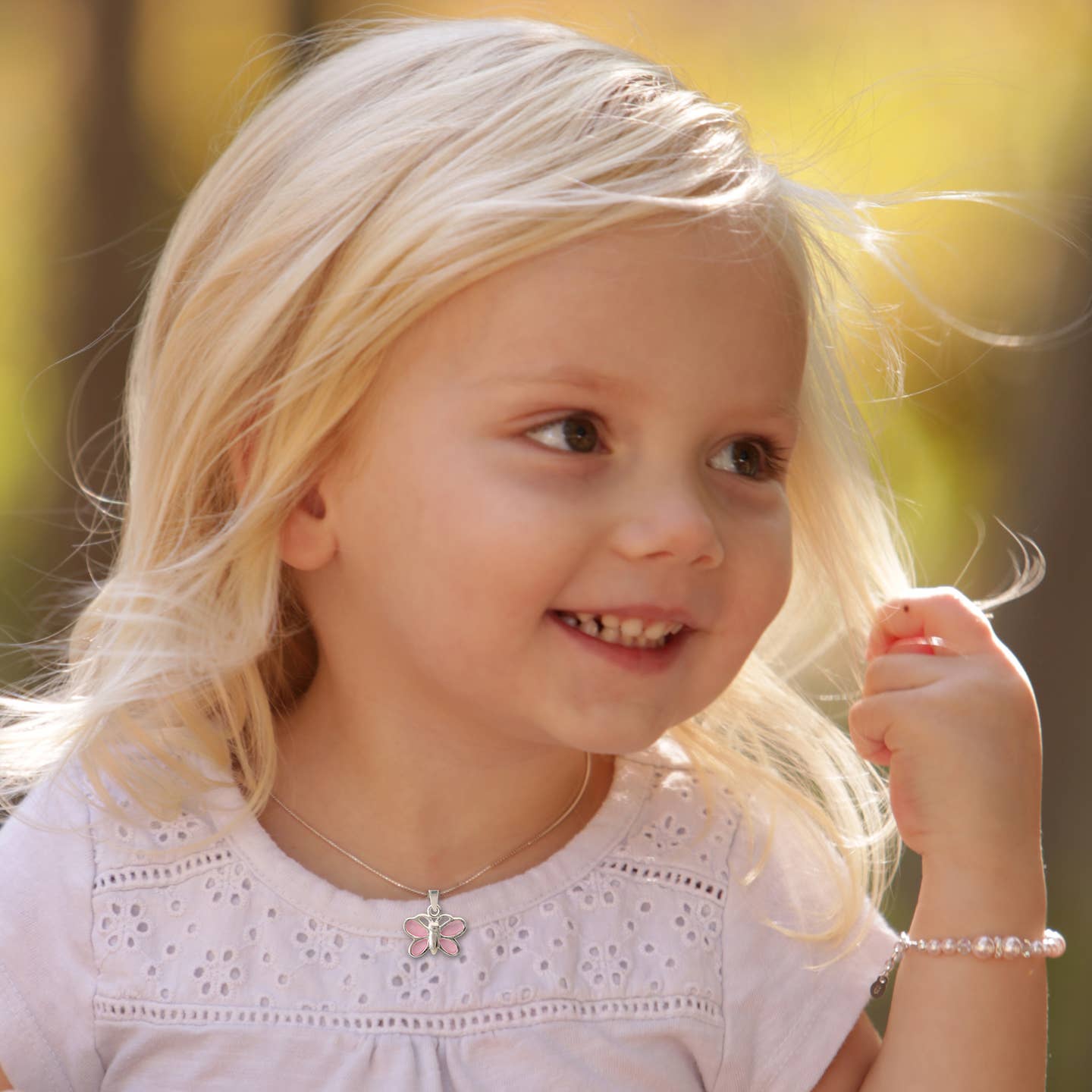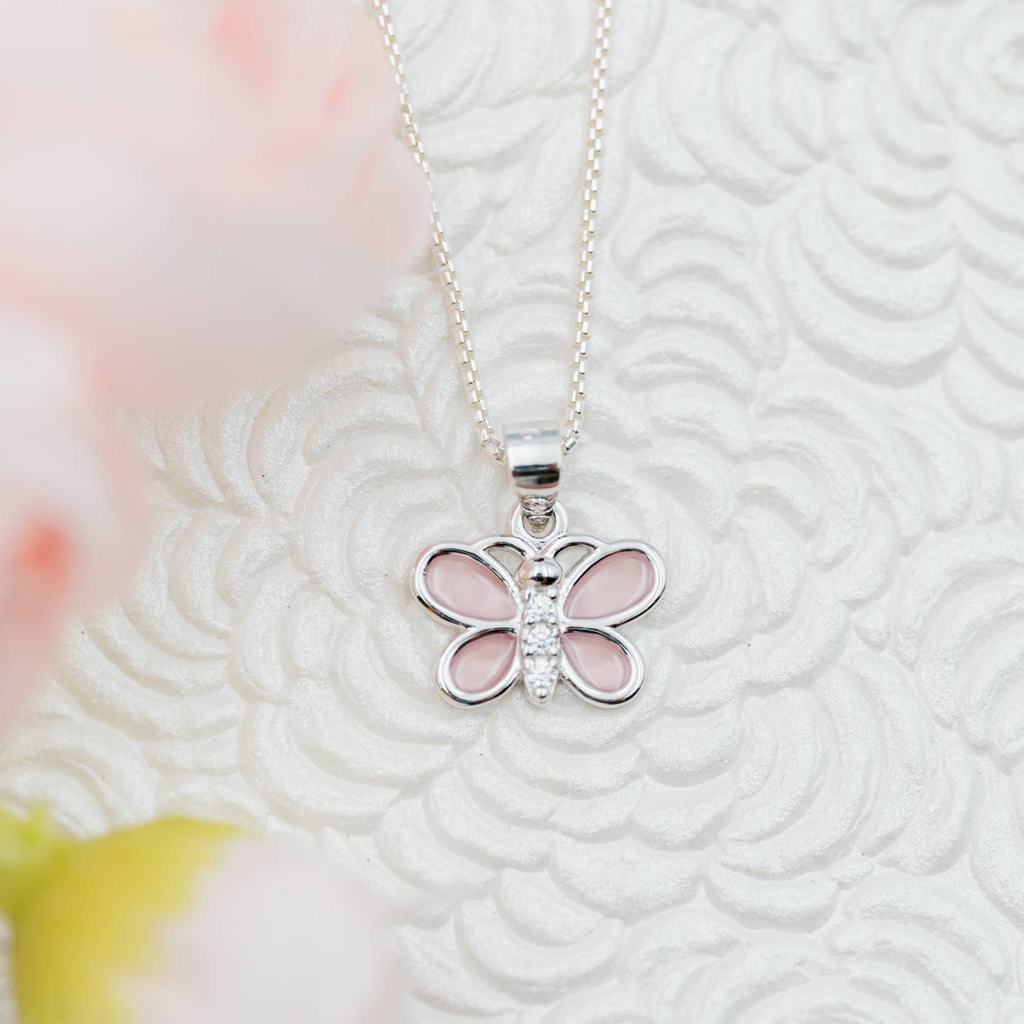 Sterling Silver Pink Butterfly Charm Necklace with sparkling CZs on a 14" Italian Chain. This dainty pink butterfly pendant necklace has matching earrings available as well. What a special keepsake gift for toddlers, little girls and children! Necklace comes in beautiful gift box that kids love.