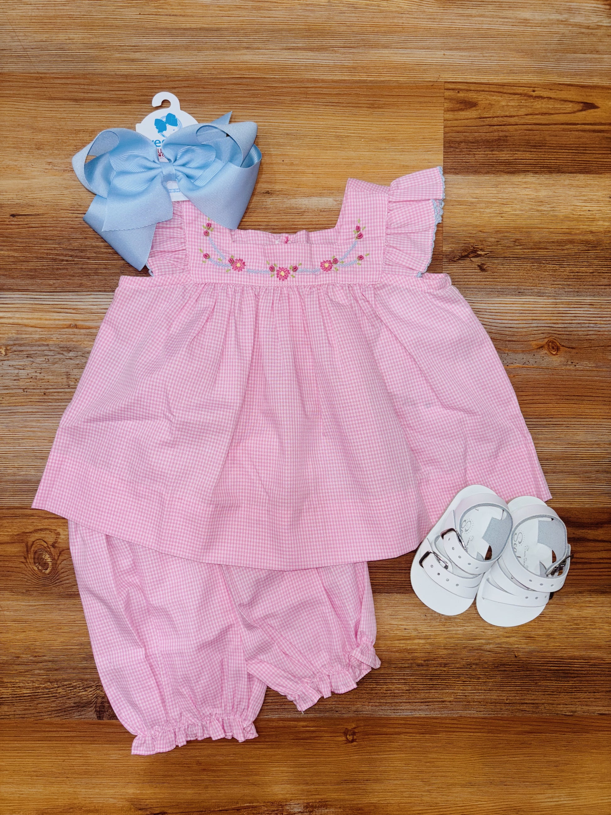 Discover the perfect combination of style and comfort with our Pink Celia Mae Bloomer Set. Made from soft and breathable fabric, this set features a beautiful pink color that will surely make your little one stand out. Designed with your baby's comfort in mind, this bloomer set is a must-have for any fashion-forward parent.