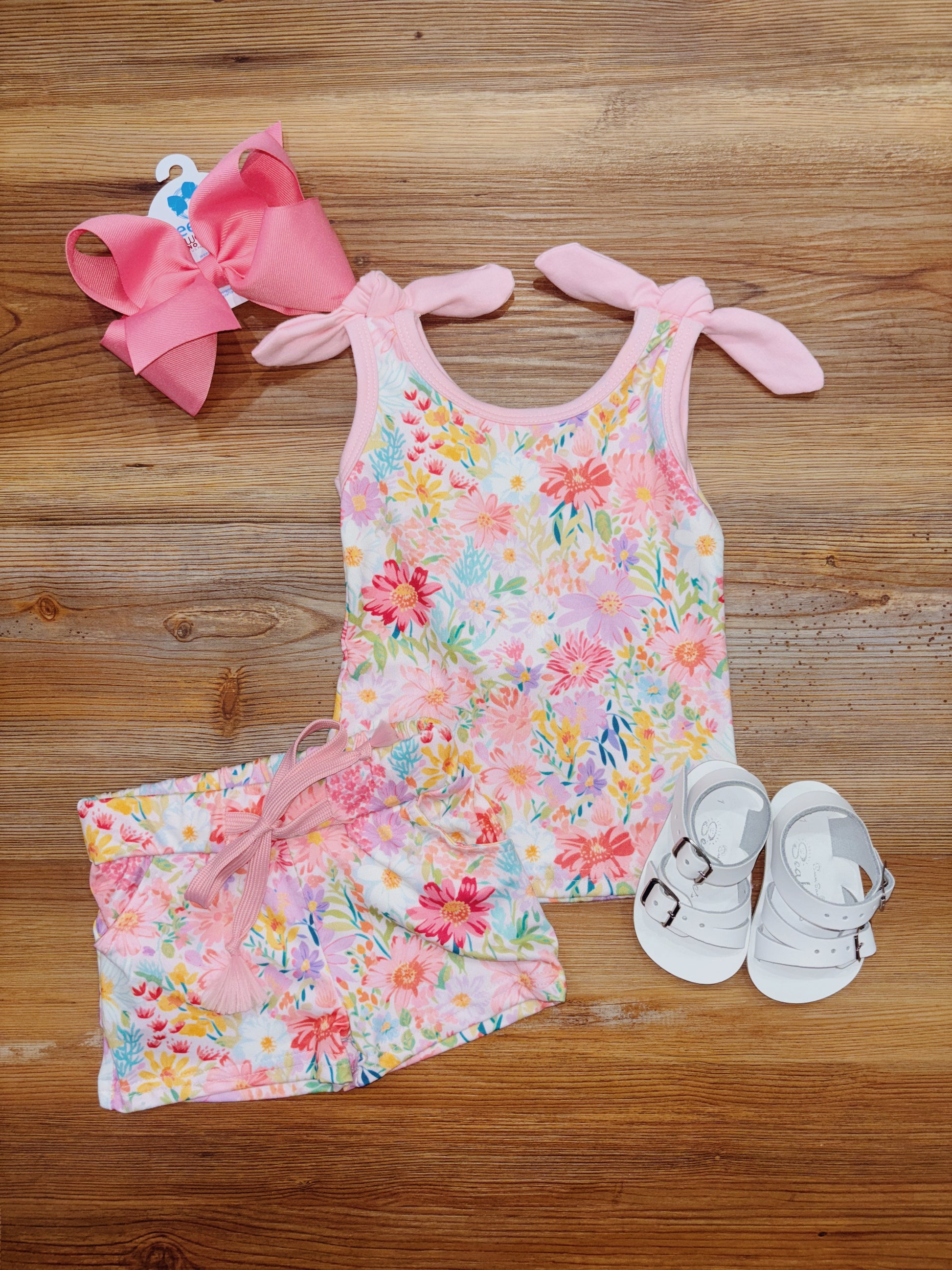 This charming set features a soft milk silk fabric that feels gentle on the skin. The pink floral shirt is adorned with delicate pink ribbons on the shoulders, adding a sweet, playful touch. Matching shorts come with a coordinating pink drawstring for a perfect fit. Ideal for sunny days or cozy lounging, this set combines comfort and style effortlessly.