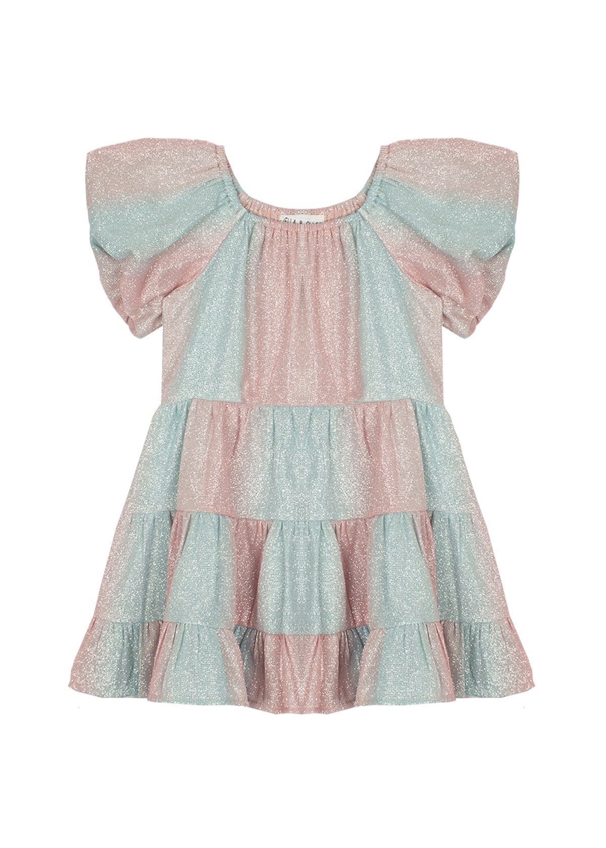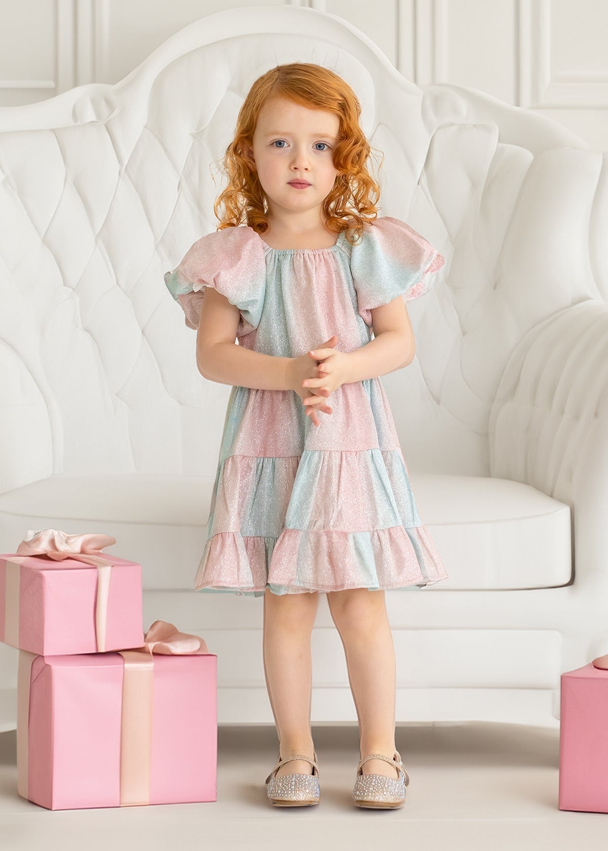 This delightful girl's dress is crafted from a sparkling, lightweight fabric that features a stunning gradient of pastel pink and blue. The dress is designed with a tiered, A-line silhouette that flows beautifully with every movement. Puff sleeves add a touch of whimsy, while the shimmery texture ensures she?ll stand out on any occasion. Perfect for special events or adding a bit of magic to everyday wear.