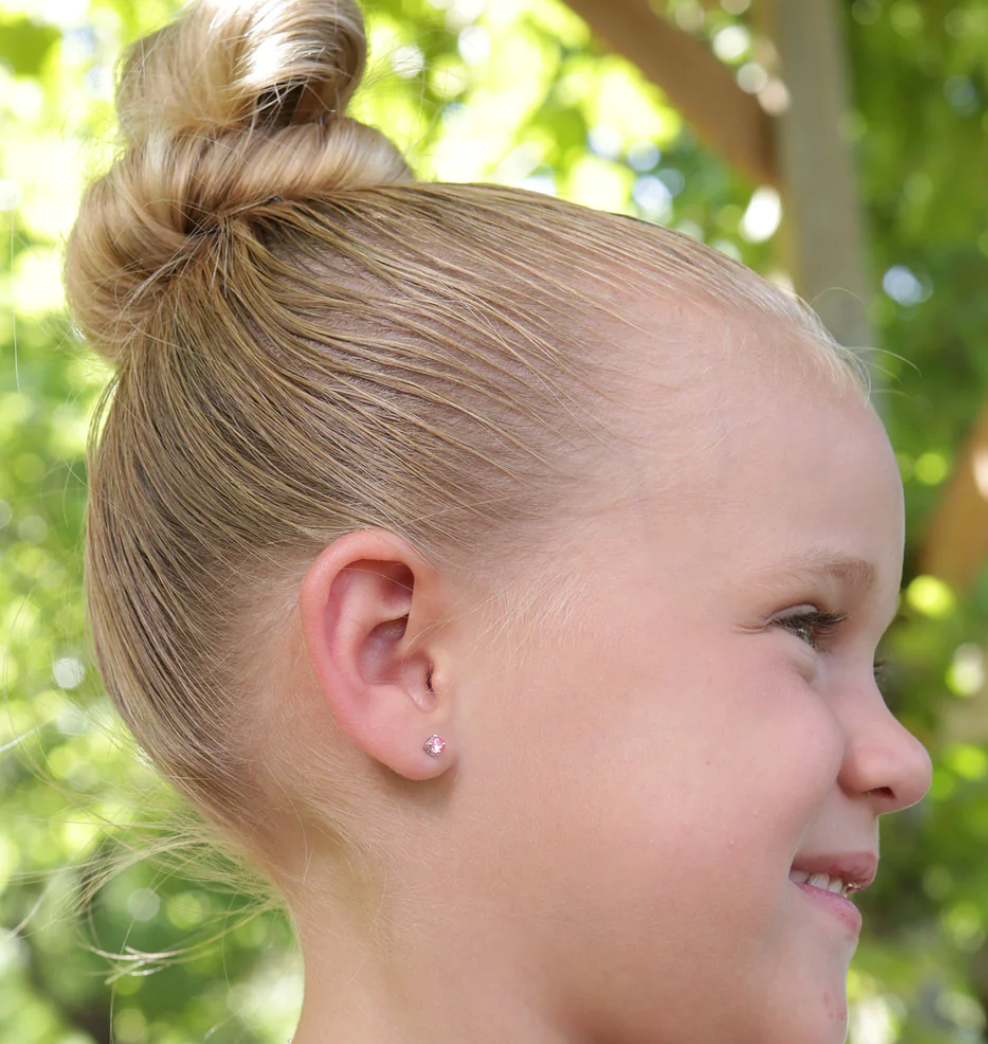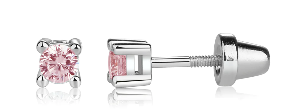 Sterling silver dainty pink CZ stud earrings for little girls (3mm). These sweet little earrings are rhodium plated for everlasting quality with screw backs so she won't lose them and come packaged in darling gift box! These earrings are genuine .925 sterling silver and should not irritate sensitive ears.