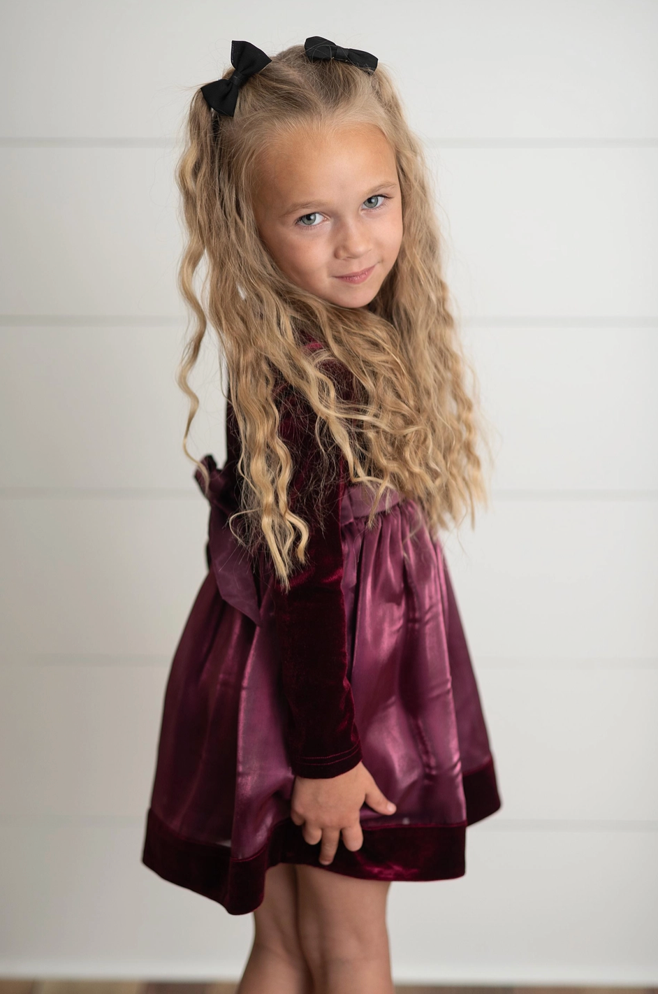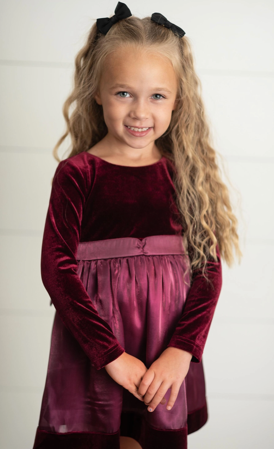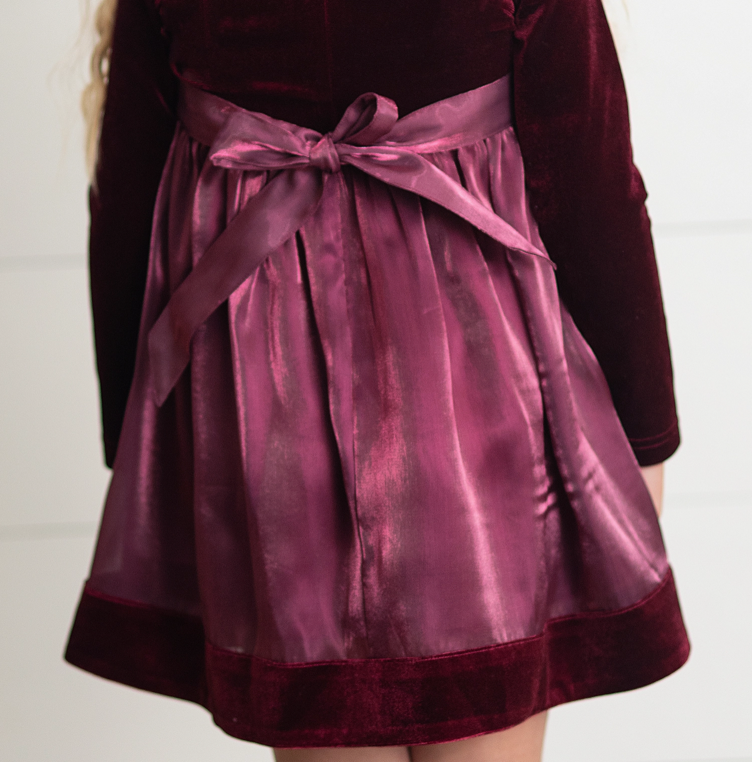 This kids dress is elegant and classic with its plum color and velvet fabric. The long sleeves provide warmth and comfort while the back ties add a touch of sophistication. Perfect for any special occasion, your child will feel stylish and confident.