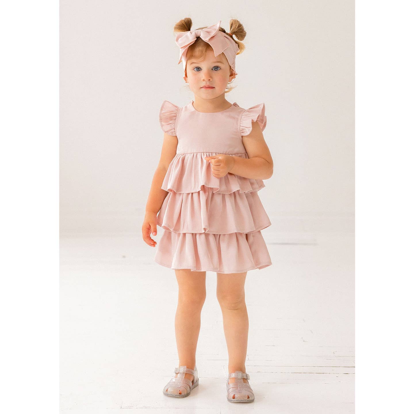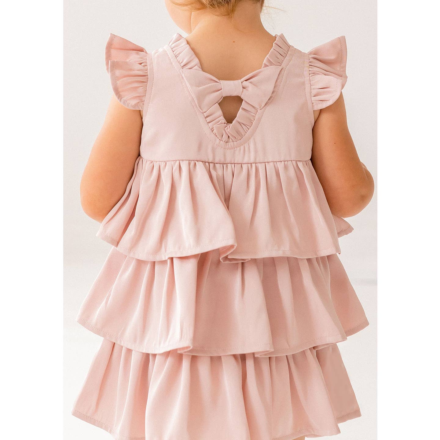 This charming dress presents a tiered silhouette, creating a playful bounce with each step. Its flutter sleeves and gentle ruffles add a touch of whimsy, while the soft, blush pink fabric ensures comfort. It's an enchanting choice for any special occasion, embodying the sweet, refined style of Mabel and Honey. Fabric Care 100% POLYESTER Machine Wash Cold | Line Dry Do Not Bleach