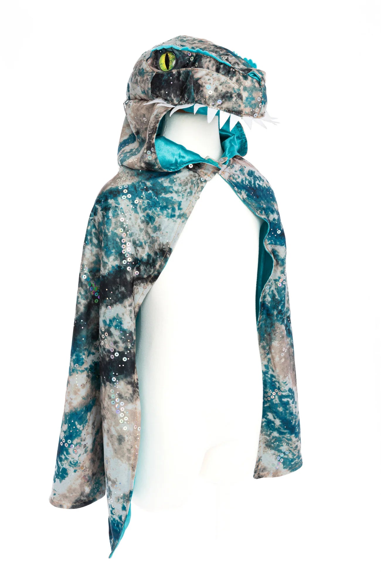 Featuring a hand-dyed teal & brown fabric, and heat-sealed sequins, our new Raptor Cape is a great addition to any dinosaur lover's collection! The cape is lightweight and soft to the touch, making it easy to wear for a long time. The hood is made of a stiffer material to hold its shape, and the cape attaches to the back with a Velcro closure. The cape is lined with a beautiful rich teal satin & finished with realistic, vibrant green eyes!