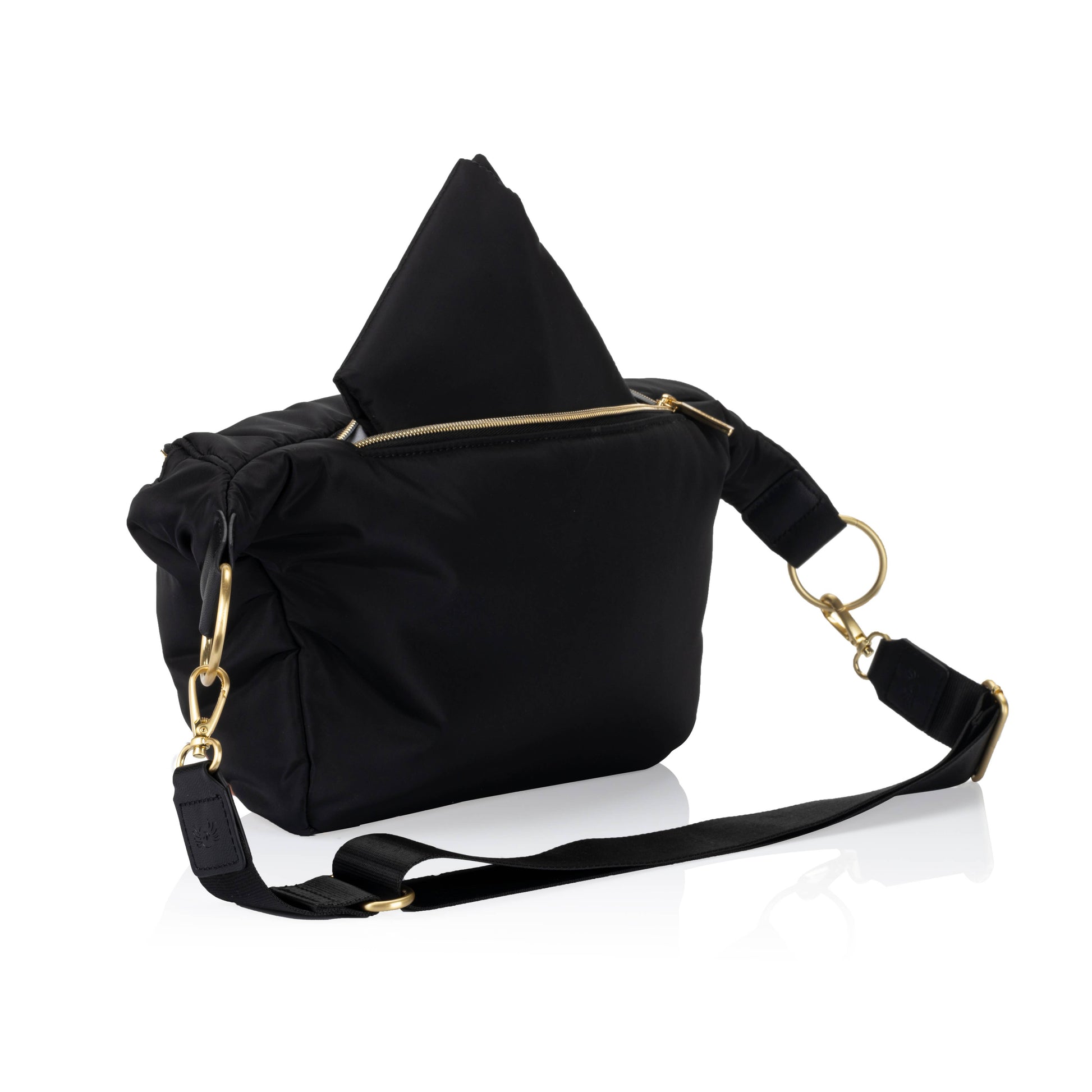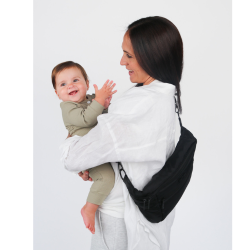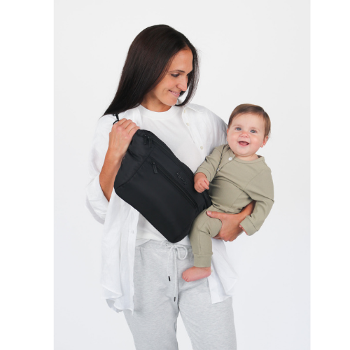 Inspired by fashion trends, this versatile bag is a new must have essential for parenting! The lightweight fabric makes this bag easy to wear around your waist, or as a crossbody. 3 easy access pockets with wide, zippered openings and a coordinating changing pad. Holds 3 diapers, wipes, and onesie.