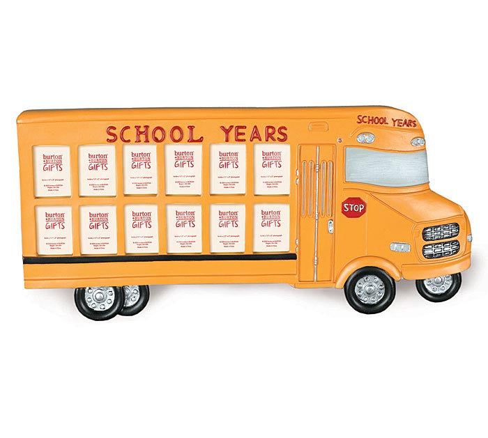 School bus shaped picture frame that has two rows of photo windows. Has 6 photos on top and 6 on the bottom and the message "school years" at the top. Can hang on the wall or sit on a table. Holds twelve photos sized 1.5 X 2".
