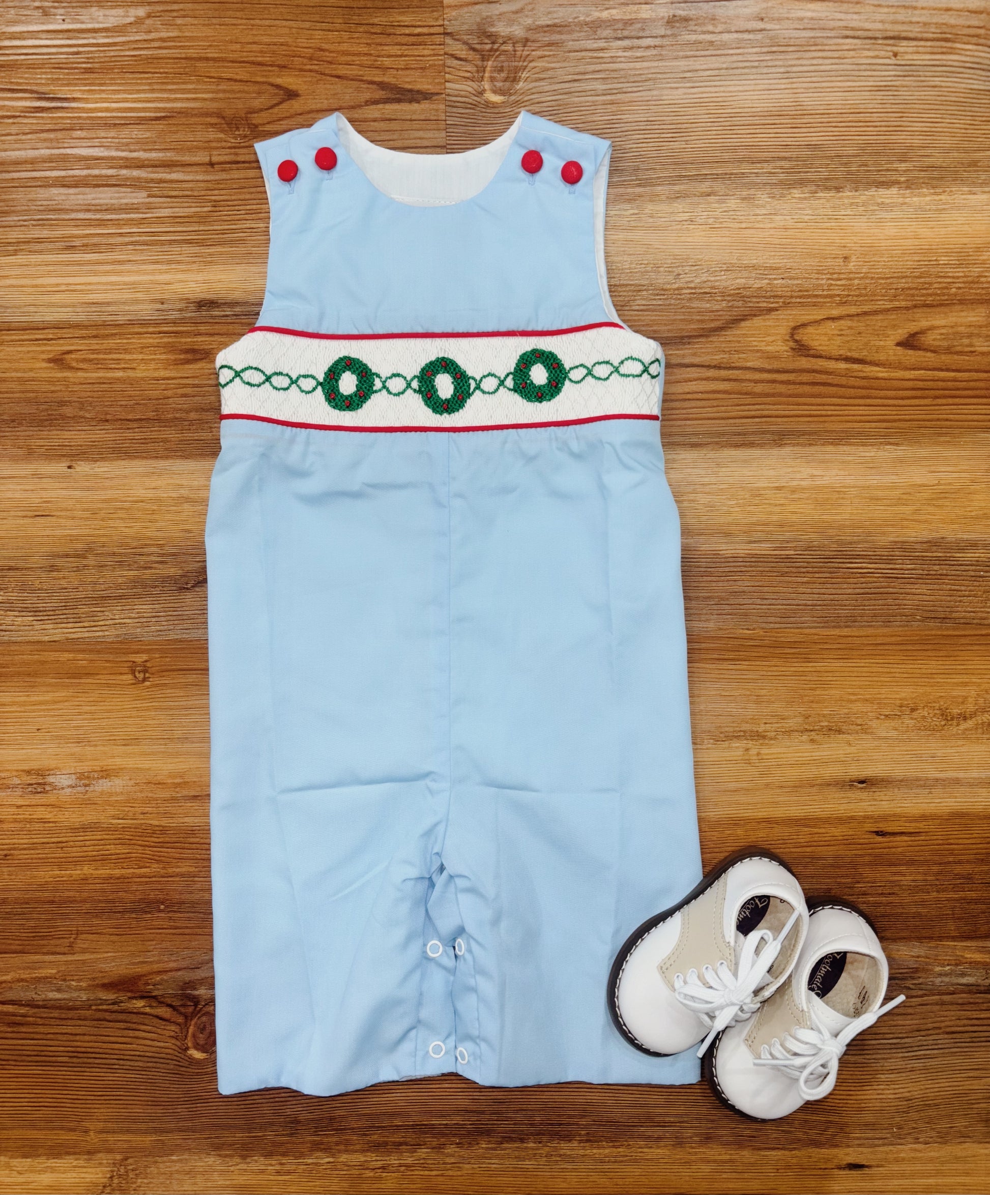 Get in the holiday spirit with this festive blue romper! Featuring playful smocked Christmas wreaths on the front and adorned with buttons on the shoulders and crotch, this sleeveless romper is a quirky and fun addition to your wardrobe. Perfect for any holiday gathering or casual outing, this romper is sure to make a statement!