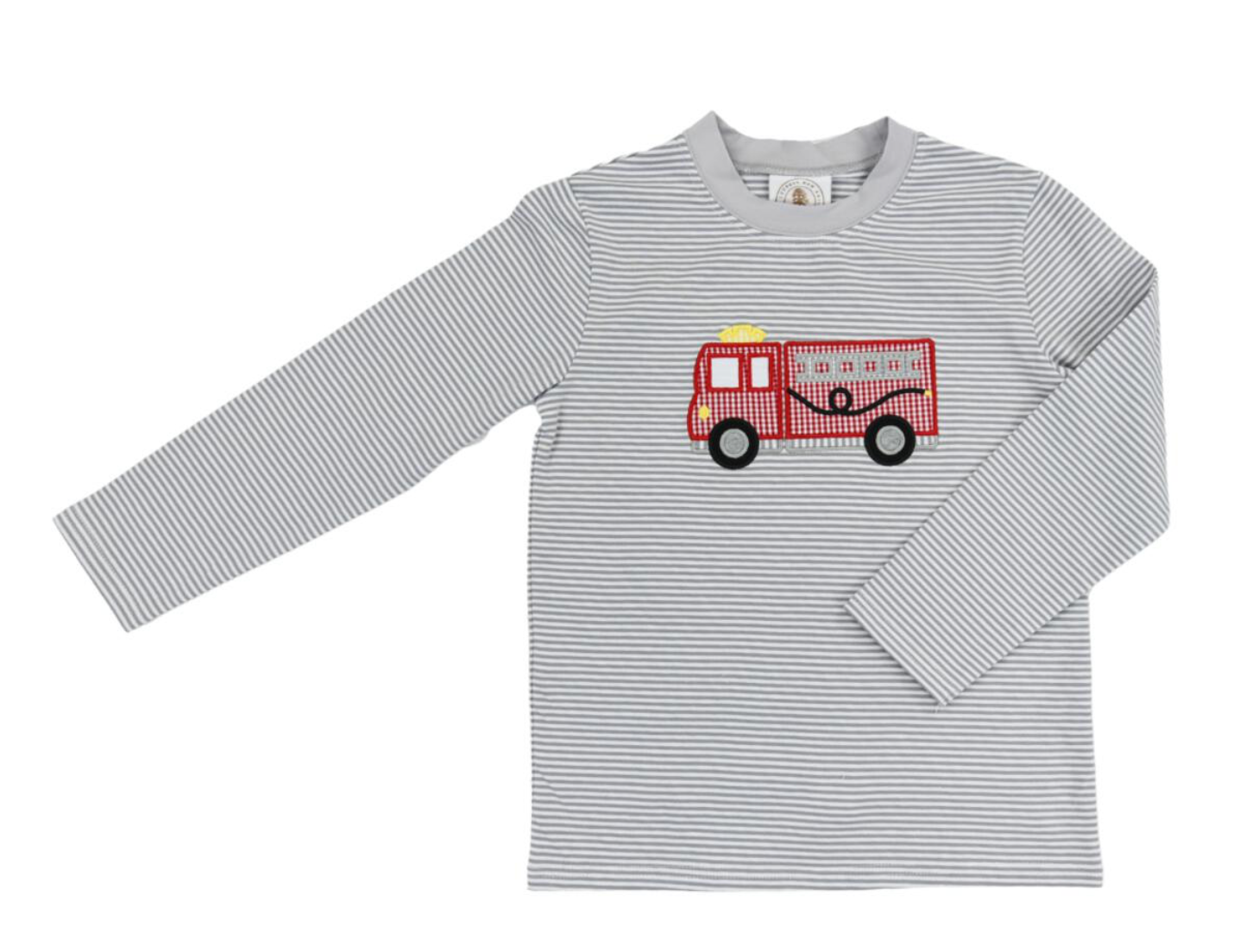 Introducing our grey striped shirt! This long sleeve shirt is perfect for any occasion. Its modern design features a fire truck appliqué, adding a touch of fun to any outfit. Expertly crafted for comfort and style. Upgrade your wardrobe with this must-have piece.